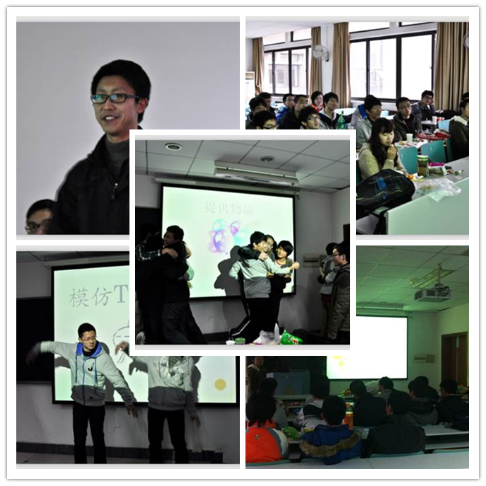 首先,在班长张哲同学和宣传委员周海燕同学的主持下,每位同学都做了一个简短和生动的自我介绍。班上的同学大多来自不同的省份地区,虽然来自地区不同,但大家的共同话题却很多,DOTA,篮球,模电,18大,改革开放等等,同学之间总有说不完的话题。在阵阵欢声笑语中,我们开始了破冰的第二环节---游戏环节。