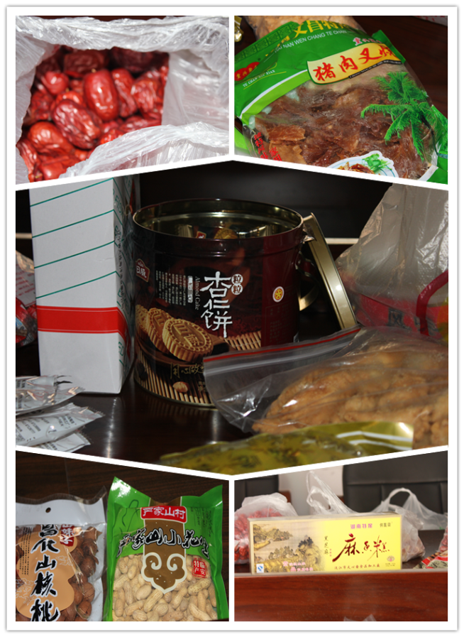 各地特产,在简短而颇具诱惑力的解说下,依次隆重登场。不一会,美食就堆满了桌子。品种之多,质量之上乘,无不叫人称绝。它们跨地域之广更为一绝:北有河北大枣,天津麻花;南有海南椰味香酥,广东特色油角;往西有西安琼锅糖,四川棒棒娃;往东有前童香干,大连海鲜,南京稻田鸭;中部有湖南麻香糕,重庆怪味豆。一出国旅游的同学还特意带来了夏威夷芒果干。真是众星云集,争奇斗艳!
