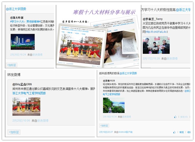 寒假期间,全讯600cc大白菜官网团委官方微博接收到了来自全国各地的微博通知。这些微博图文并茂的记述了团委骨干们家乡的相关情况,从中可以看到当地政府和民政部门对十八大重要会议精神的宣传力度,也看到当地民众对十八大会议精神高涨的学习热情。十八大的召开,正处在我国全面建设小康社会的关键时期和深化改革开放、加快转变经济发展方式的攻坚时期,同时也是在迅速发展后期间的一个节点,许多同学也在自己的微博里贴出了家乡迅速发展的对比图,在其微博内容的字里行间,流露着浓浓的乡情与自豪。