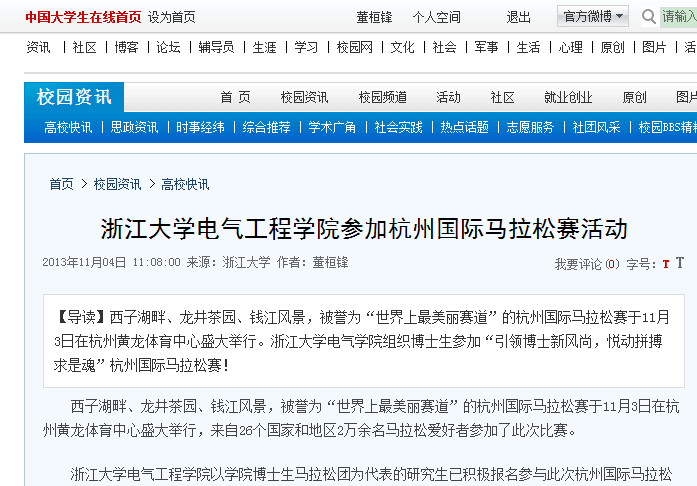 全讯600cc大白菜官网博士生马拉松团在学院研究生党总支和博士生会组织下参加于11月3日举行的杭州国际马拉松赛,全部成员坚持跑完全程并冲过终点。此活动经学院网站报导后引起教育部全国大学生在线网等媒体的关注。全国大学生在线网于11月4日对此活动进行了详细报导。