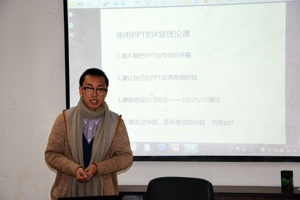 12月1日下午,学工部现代写作中心的董征远学长应邀前来紫金港校区小剧场B座215,给参加培训的“步步‘精’心,脱颖而出”风采展示训练营SQTP项目组学员关于PPT制作上了生动的一课。