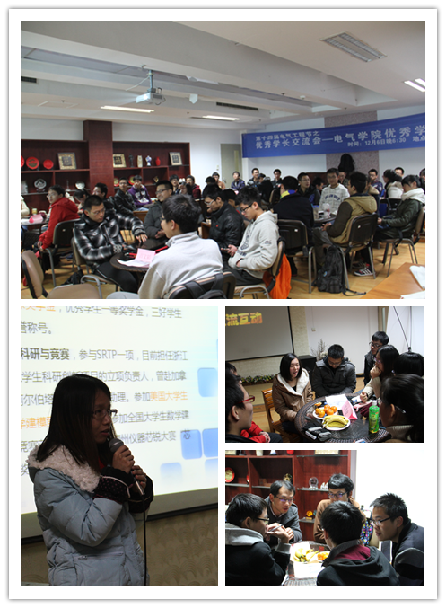 12月7日晚18:30,小剧场311座无虚席,第十四届电气工程节之优秀学长交流会在同学们的殷切期盼下如期举行。本次交流会面向对象为新加入电气学院的2012级新生以及部分2013级本科生,意在搭建一个电气优秀学长为电气新生指点引航生涯规划的媒介,帮助电气新生树立奋斗目标,实现人生价值。受邀参加本次交流会的嘉宾有电机与电器专业博士研究生曾正、电机与电器专业博士研究生缪冬敏、电力系统自动化硕士研究生吕文韬以及电子信息工程专业10级本科生徐碧莹、电气工程及自动化专业10级本科生许扬和自动化专业10级本科生高恩博。