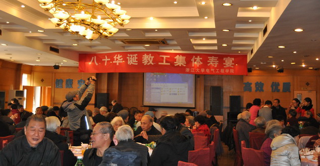 2013年12月19日中午,全讯600cc大白菜官网为八十大寿的老寿星们在玉泉校区食天一隅举办了一场集体贺寿活动。2013年,学院新添了12位跨入八十周岁的老寿星。韩祯祥院士、学院党委书记王瑞飞、党委副书记王玉芬与全体离退休教职工一起满怀喜悦地参加了此次活动。