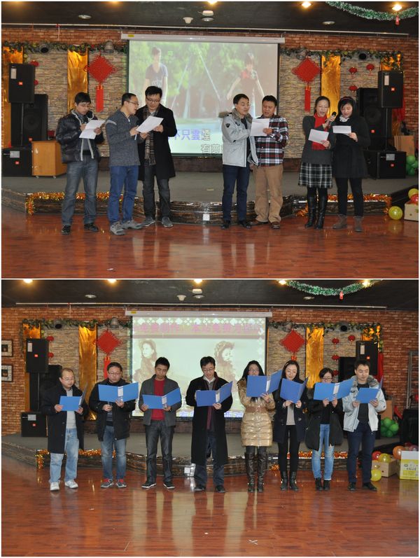 表彰大会结束后,学院全体教师进行了联欢。凛冽的冬风吹不散团聚的热情,沁骨的寒意冻不住欢笑的面容。学院973青年羽毛球队一曲《梦想天空分外蓝》拉开了联欢会的序幕,高亢的歌声激起了在座各位“海阔凭鱼跃,天高任鸟飞”的英雄豪情。在职教职工、在校学生纷纷登台,为大家表演了内容丰富、形式多样的节目,有恢宏的合唱,有悠扬的独吟,有柔中带刚的太极拳表演,有乐翻全场的互动游戏。联欢会高潮迭起、精彩纷呈,为全院的教职工奉献了一场视听的盛宴。
