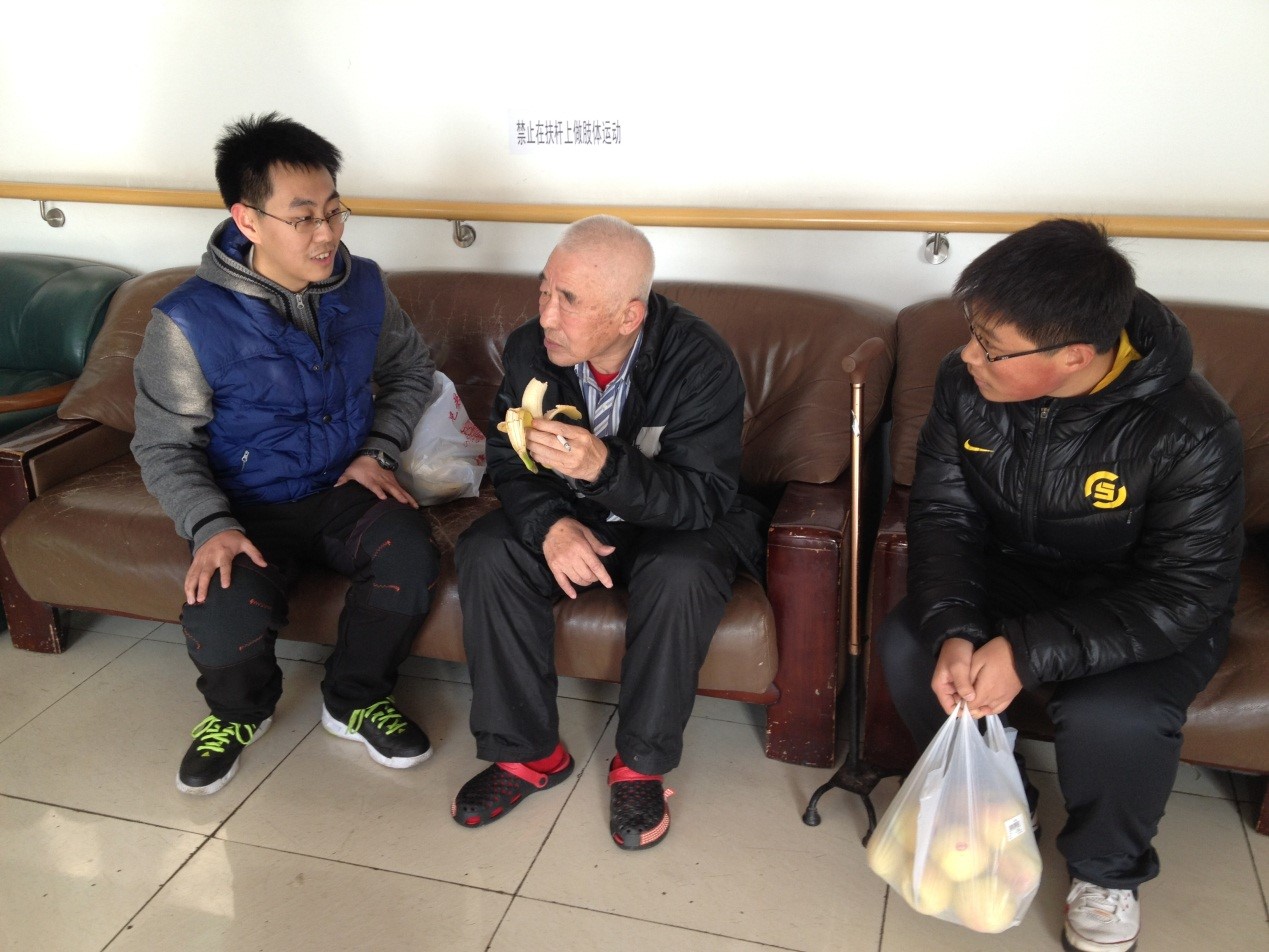 经过了清理后已经是3点多了,这时在大厅的休息座位上已经坐了几位老人,我们为老人送上水果,并致以慰问。我们同其中一位老人聊起了天,这位老人今年62岁,已经来到这家养老院3年多了,他个人感觉在这里住的还习惯,每隔一周左右,就会有亲人来看望他,早上一般9点多吃早餐,伙食在他看来还是不错的,并且他认为养老院的收费制度也可以,价位适中;他也和我们说,他们唯一缺少的是一些运动器材,除了老年公寓正门的一些健身器材外,整个5层的老年公寓没有其他可以锻炼的健身器械,平常他们的娱乐活动就是打打麻将,打打扑克什么的。