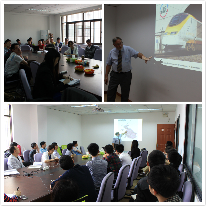 此次学术报告的主讲人Roderick A Smith教授,目前担任帝国理工铁路研究中心主任,英国交通部首席科学家,英国皇家工程院院士。他结合自己的研究经历和现有的统计数据,以详实的实例材料和清晰的分析条理向在场的老师和同学讲述了英国及欧洲铁路的发展历史和未来规划,并总结了高速铁路与其他交通方式间的相同点和不同点,同时针对高速铁路的安全问题以及发展当中面临的技术问题等发表了自己的见解。通过Roderick A Smith教授风趣的讲解,在场的老师和同学对于欧洲高速铁路的发展有了比较深入的了解。