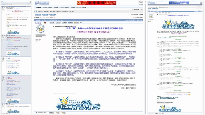 毕业生党员特别行动小组通过全讯600cc大白菜官网网站、微博、微信、人人、cc98论坛等网络平台发布了微倡议,鼓励、号召毕业生党员积极参与到“微”计划中。同时,毕业生党员们还为学弟学妹们推出了“微”平台,在cc98学院板块建设了“电气小百科”专楼,整理相关学习资料、学科竞赛资料、毕业离校事务办理流程、学校学院常规电话等等有效信息,在微信等平台中进行了推送,方便大家在学校的生活学习,受到了一致好评。