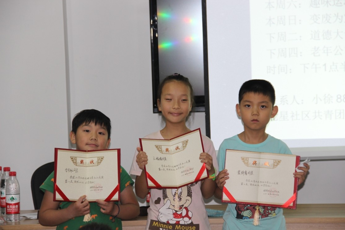 活动的最后一个阶段是环保知识竞赛,是由赖佳俊同学和付灿宇同学共同组织的。我们将30多位小朋友一共分为5组,每一组轮流回答问题,当一组回答问题时,只有一个组员能代表全组回答,若回答正确,则这个小朋友就能得到1分、2分或3分,最后根据总分来确定获奖名次。比赛开始后,许多小朋友都争先恐后的回答问题,其中一个小男孩和一个小女孩表现最为突出,但他俩分数一样,为此我们还提出一个额外的问题作为决胜环节,最终小男孩更胜一筹,获得了一等奖,在给每个小朋友颁发完奖品和纪念奖以后,活动也在所有人热烈的掌声中落下帷幕。