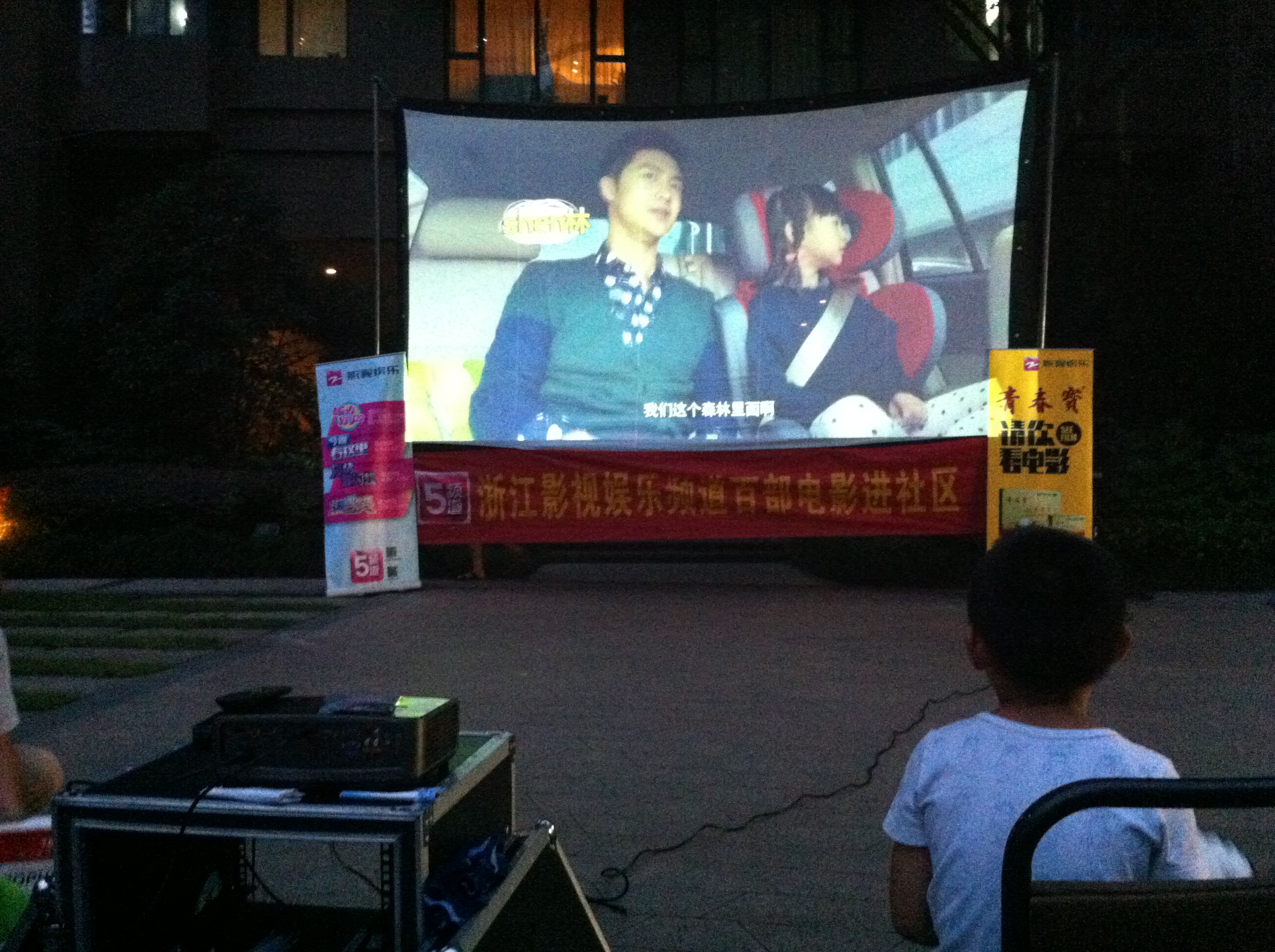 8月8日,花园亭社区的张彦,陈吉祥同学负责了电影进社区活动,帮助社区的工作人员做宣传,一起安装放映设施,维护现场秩序,电影还没开始,小区广场就聚集了许多人,小朋友在愉快的玩耍,大人们互相交谈。电影开始时还爆发了欢呼声。播放的电影是《爸爸去哪儿》,这部电影特别适合小朋友与家长一起观看,一起体会父子、父女间醇厚的爱,搞笑中带着催泪的感动,感动中又不乏孩童的天真灿烂。观看过程中,一些后面的小朋友感觉被前面的人阻挡,都纷纷拿着椅子坐到了前排,大人们都自觉的往后坐,场面非常和谐,现场还时不时爆发出欢笑声。通过这样的活动,邻里关系更加和谐,家庭亲情得到充分的表现。