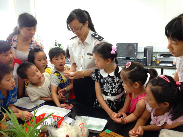 8月6日,铁佛寺社区的张烨璐同学参与组织了“大手拉小手,丝绸检验一起学”活动,协助社区负责人核对参与活动小朋友名单,维护现场秩序。活动当天,该社区的小朋友们与爸爸妈妈一起来到杭州检查检疫局参观丝绸检验实验室。实验员们耐心细致地讲解了丝绸品种的好坏,检验方法,以及一些仪器设备的功能和使用方法,并且满足了小朋友们的好奇心,让他们亲身体验了一番检验过程。过程中,小朋友们非常积极主动,纷纷涌上前,摸摸质感,闻闻味道,还向工作人员提出了很多新奇的问题,如为什么两条蚕丝被闻着味道不同等,实验员们一一为他们解答了这些问题,还夸他们观察细致。除了小朋友们,家长们也表现出很大的兴趣,他们也向实验员们谦虚求教,认真记下显微镜下羊绒、羊毛、化纤等等的特征,家长们都表示受益匪浅。这样一次活动,激发了小朋友们对于科学的好奇心,也让家长们有更多地机会和小朋友们一起互动,可谓一举两得!