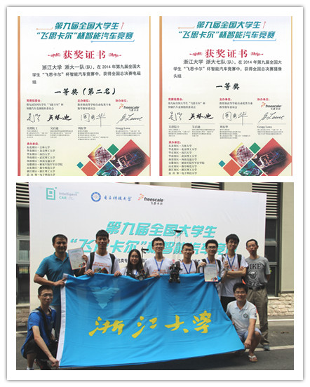 2014年8月21日至23日,由教育部主办的第九届全国大学生“飞思卡尔”杯智能汽车竞赛全国总决赛在成都电子科技大学举行,参加本次赛事的115个高校180支队伍是经8个分赛区的选拔后,在全国442所高校1889支参赛队(摄像头组549支、电磁组656支、光电组684支)的角逐中突颖而出,获得了参加全国总决赛的资格。我校浙大一队和浙大七队2支参赛队在7月20日至22日浙江理工大学举行的浙江省赛区比赛中,获得了全国总决赛的入场券。在总决赛期间,浙大一队和浙大七队克服了高温天气、长途旅程、训练场地紧张等带来的各种困难,在3天的时间里进行了一场饱含速度与激情的青春对决,经过激烈拼搏,最后发挥出色,在本次比赛不设特等奖的情况下,浙大一队荣获全国总决赛电磁组一等奖第二名,浙大七队荣获全国总决赛摄像头组一等奖。