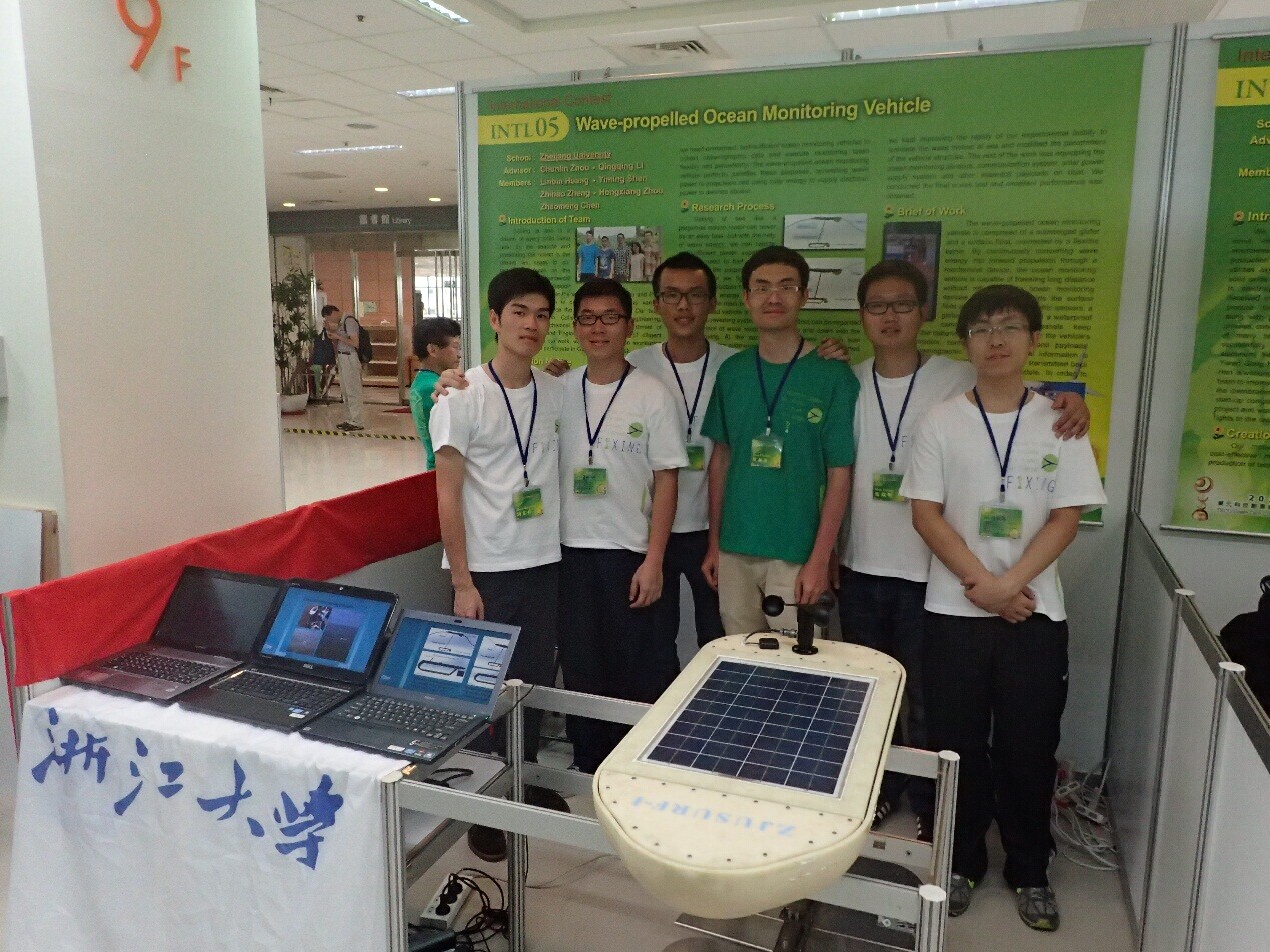 2014年8月26日—8月30日,由全讯600cc大白菜官网本科生黄林彬、沈燚明、郑志豪,控制科学与工程学系研究生周宏祥,机械工程学系本科生陈朝萌组成的团队代表2023白菜网总站大全应邀赴台湾参加2014“东元科技创意竞赛”(指导、带队老师:控制系周春琳老师、李青青老师),其团队作品《Wave-propelled Ocean Monitoring Vehicle》从19件决赛作品中脱颖而出,捧回大赛冠军奖杯并获得1.2万美元奖金。