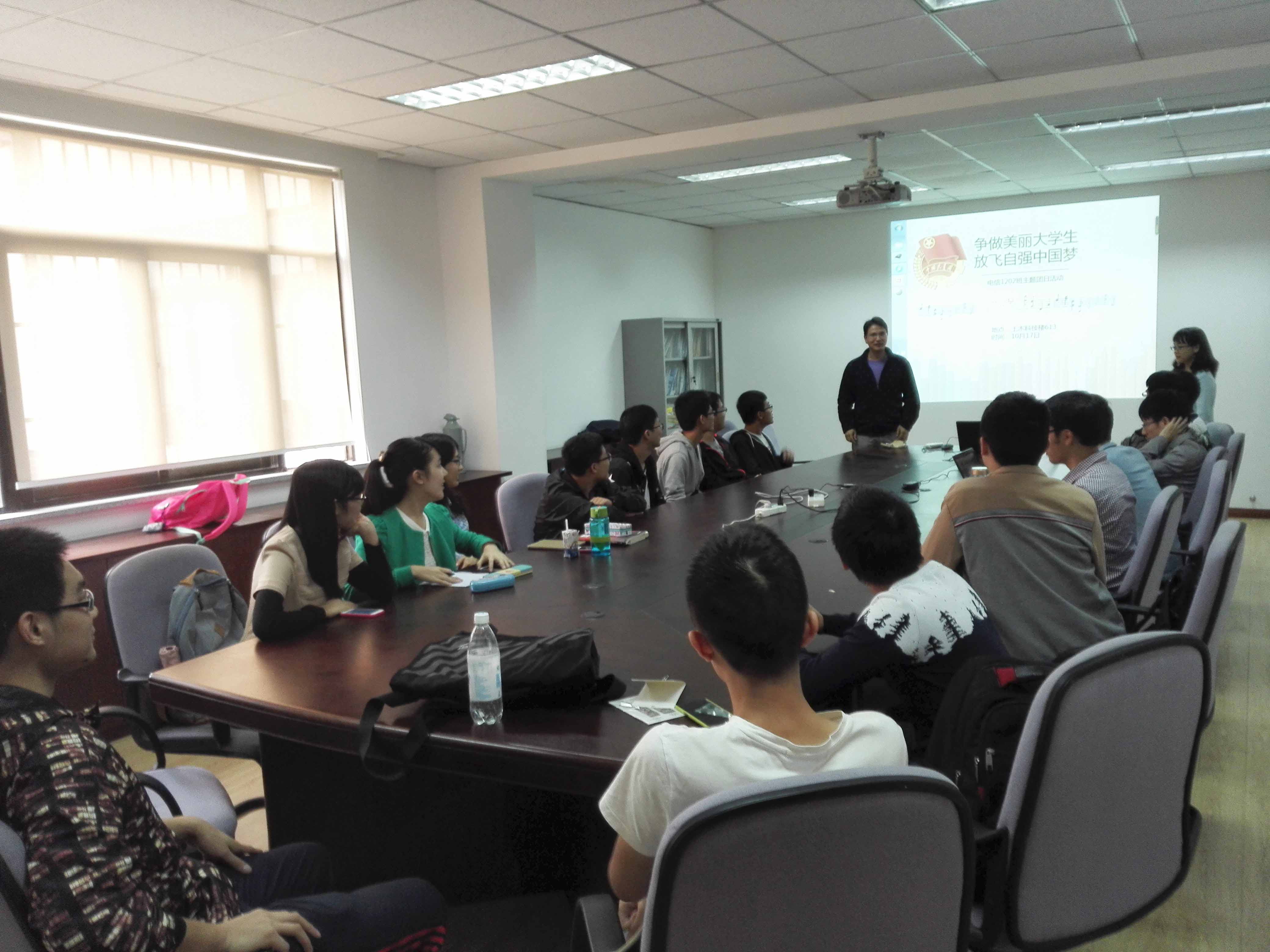 秋高气爽,万里无云,2014年10月17日,全讯600cc大白菜官网电子信息工程1202班三十余名同学,共聚土木科技楼613室,在当天下午1点正式开始了“争做美丽大学生,放飞自强中国梦”主题团日活动。此次活动,打破了刚开学同学们之间的沉默,同时班主任虞小鹏老师的到来也使得师生之间的感情增进不少。