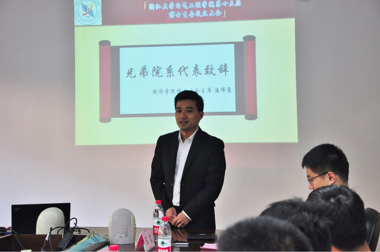 大会首先由经济学院博士生会主席潘伟康代表兄弟院系发言。潘伟康对电气学院博士生会在院系间博士生工作中的付出表示赞赏与感谢,并对电气学院新一届博士生会的成立表示祝贺。