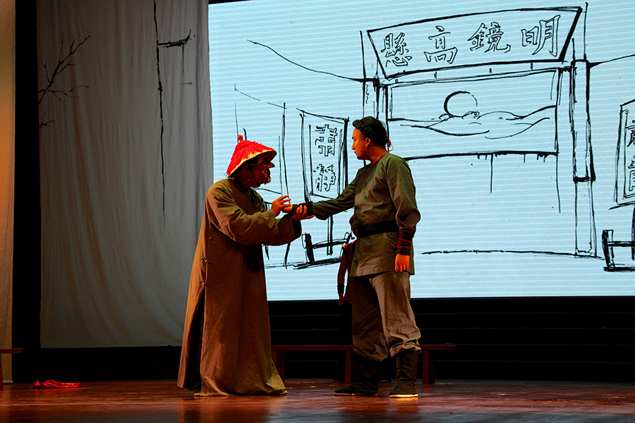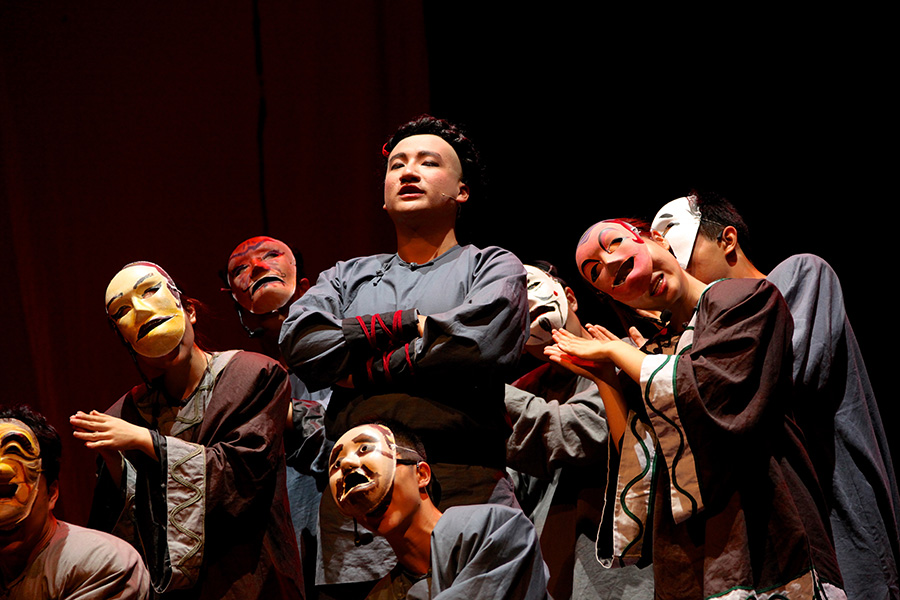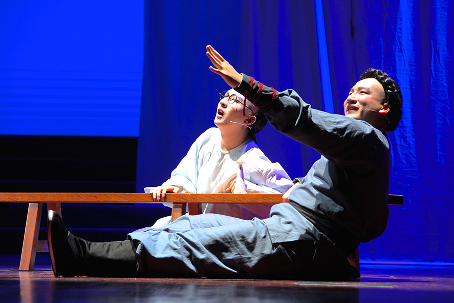 随后,在观众掌声雷动中,黑白剧社带来的精彩话剧《秀才与刽子手》拉开序幕。《秀才与刽子手》是一个怪诞色彩的黑色喜剧,编剧以现代黑色喜剧的形式和略带怪诞的手法,通过两个封建社会国家机器最核心部分的执行者——一个是政治权力选拔制度下的秀才,一个是用血腥暴力维持法律权威的刽子手——面对废除科举与酷刑这一影响中国社会发展的两个重大事件的遭际,冷峻地剖析了封建文化形态对人性的扭曲。观众随着情节的发展时而大笑,时而悲戚,时而沉思,场内气氛十分活跃。