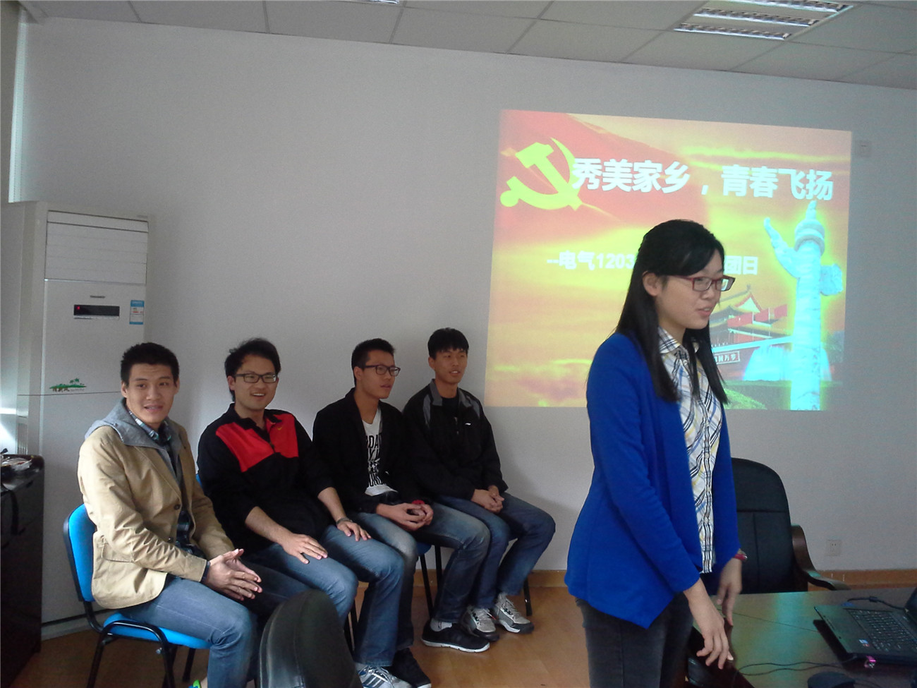 十月的杭城秋意渐浓,魁梧的梧桐装点着玉泉的天空。10月24日下午,电气1203班的同学们在电机工程楼201召开了以“秀美家乡,青春飞扬”为主题的主题团日活动,会议由团支书徐雨萧同学主持。