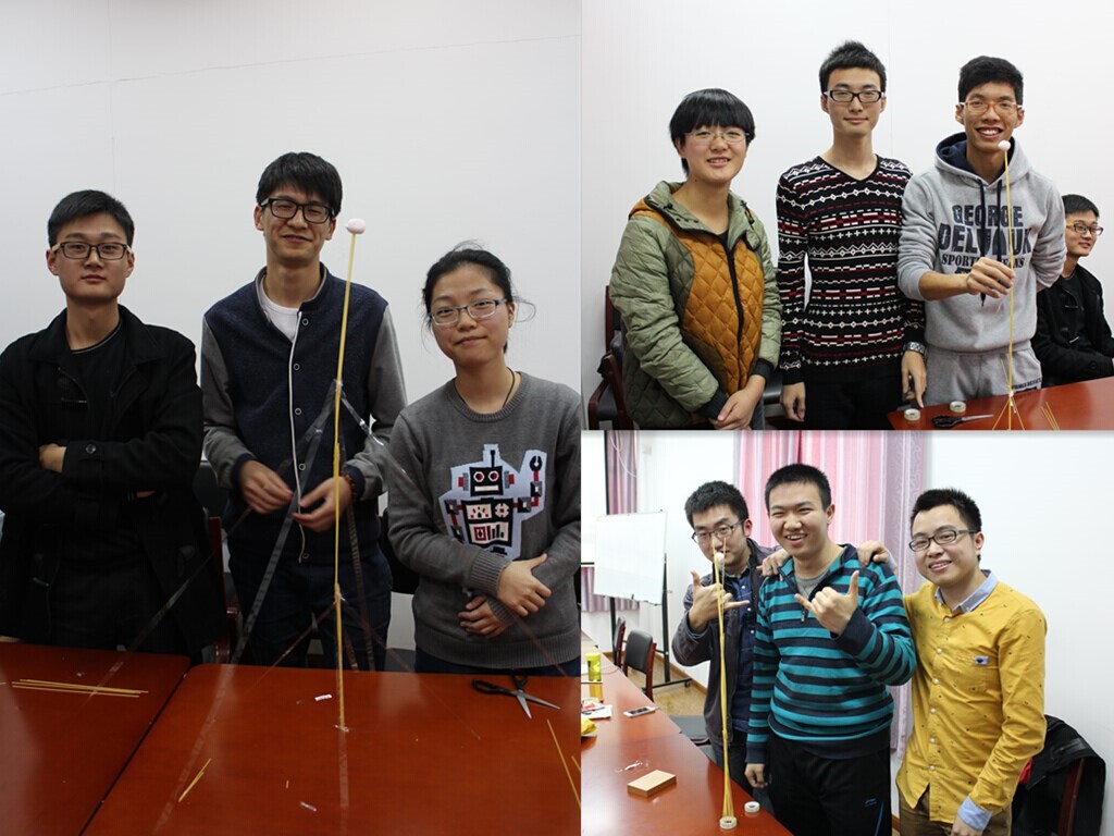 活动的第一部分是“棉花糖挑战”:到场的同学分成A、B、C三组,利用20根意大利面、一码胶带、一码棉线、一颗棉花糖,在18分钟内构造出某种稳定结构,棉花糖位置最高的组胜出。分发好材料后,比赛计时开始,经过短短几分钟的头脑风暴,三个小组都确定了各自的方案,争分夺秒开始搭建。三个小组思路迥异:A组借鉴了斜拉桥的原理,利用胶带作为拉索来固定塔身;B组则利用绳子的张力搭建三脚架作为承重底座;C组巧妙地跳出思维定势,利用胶带的内环作为底座箍住塔身。转眼间18分钟时间到,三个小组都成功搭建到三层,A组以微弱之差夺得了第一名,获得了精美的奖品。比赛结束后,各组组长分享了本组思路,小组之间互相学习,取长补短,意犹未尽。每组成员都发挥了自己的创意、想象力并且默契地进行团队配合,很好地完成了挑战。