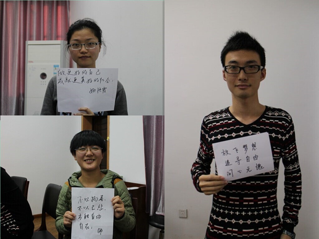 通过上面的活动,在场的同学都对自己心中的梦想、价值观有了重新的思考与考量。活动的最后一部分是“我为核心价值观代言”。对于核心价值观,每个同学都有自己的理解,在团支书的主持下,大家都分享了自己的观点。最后,每个同学郑重地写下了自己的宣言。希望在今后的人生道路上,每个同学都能身体力行,践行核心价值观,共筑中国梦!