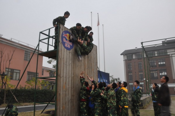 最后一个项目是翻越“求生墙”,也被称为“毕业墙”。这是一个4米高的垂直墙壁,如想翻越,需要人梯的支撑和上方同学的拉提。爱班同学勇于承担,所有男生都甘当人墙,乐于拉提,帮助小伙伴翻越求生墙。