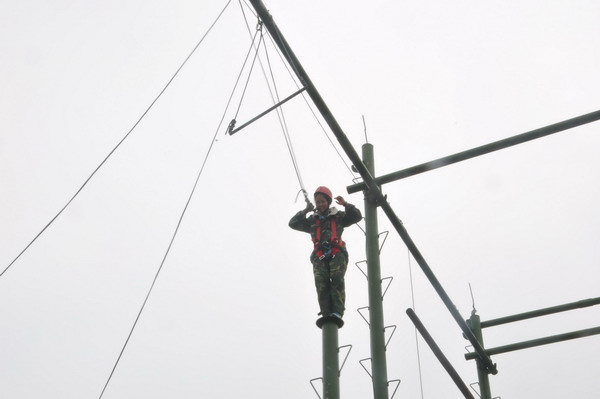 高空抓竿项目需要同学爬上6米高的竿子并直立站在竿上,双脚跃起,抓住前方1米左右的横杆。这是一个十分具有挑战性的项目。当离开地面,走向高空;当所能依靠的只有那一根摇晃的竿和竿上的几个扶手,畏惧在所难免。但是,所有同学都克服了恐惧,战胜了自己,走出那坚实的一步,成功完成任务。