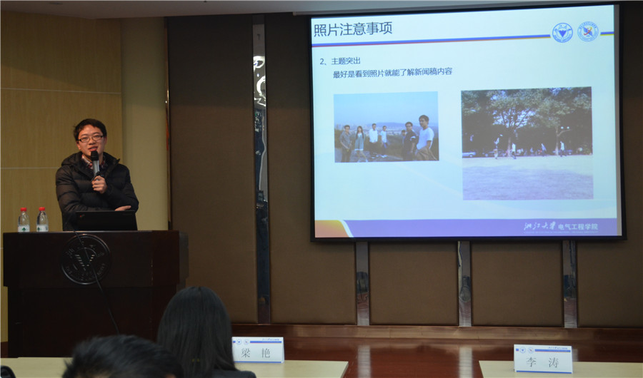 随后,李涛老师着重讲解了全讯600cc大白菜官网新闻稿的具体要求。为了给大家提供最实际有效的技巧,他举出了几个学院新闻中出现的不规范的例子,从文字内容注意事项和照片要求两个方面进行介绍。培训现场气氛欢快,老师与同学们开展了欢快的互动与交流。
