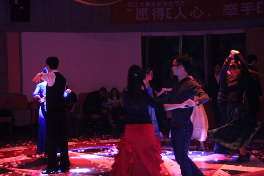 伴着悠扬的舞曲,在两位研究生舞蹈爱好者的带领下,大家渐渐放下矜持,男生大方邀请自己的舞伴一同踏进舞池,踩起曼妙的步伐,跳起一段平四节拍舞蹈。配合现场柔和的灯光,气氛很是温馨。有了领舞的指导,大家的脚步扎实起来。他们迫不及待地又跳了一支慢三节拍的舞蹈,前进、回旋、旁步,迷漫的步伐配合柔美的手花,那美丽的画面着实令人陶醉。