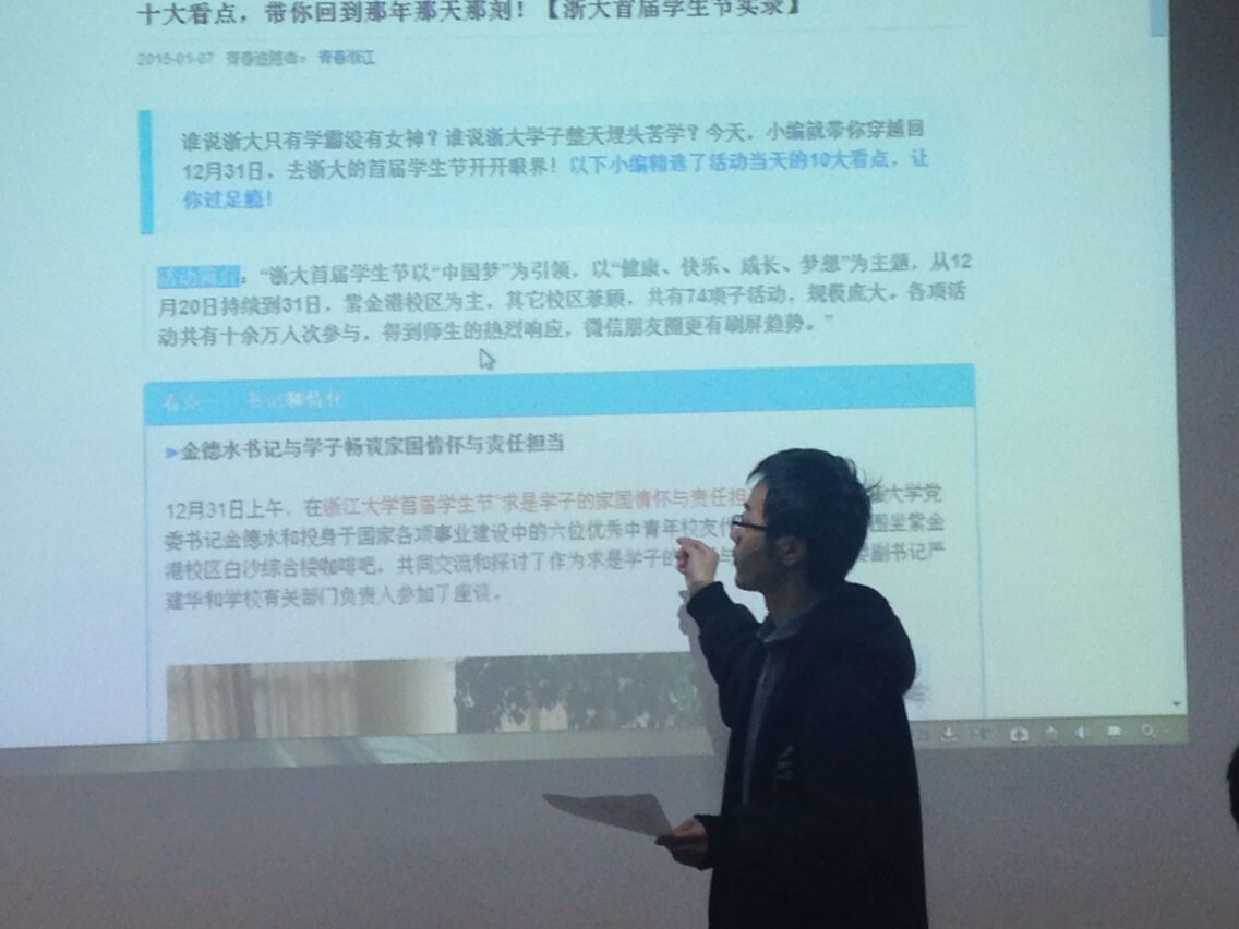 接下来,金晗同学以最近微信上点击率较高的关于浙大学生节的十大看点的文章为例,为大家介绍了微信编辑器的使用技巧,借助微信编辑器,我们可以方便地对文章格式进行美化,增强文章的可读性。