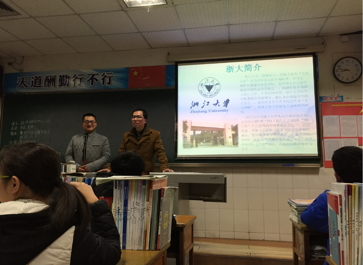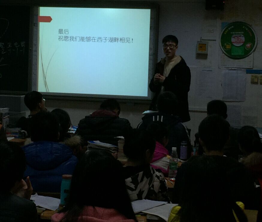 接下来我们在高三班级进行了相关报告。首先播放浙大的宣传视频,接下来由大一的同学介绍了浙大的相关情况,并且分享了其高三复习的经验,然后由大四的同学分析了近几年重庆高考的情况,以数据为基础,摆事实讲道理,告诉同学们有实力考上浙大,浙大也的确适合他们,能够给他们提供一个非常好的发展平台,通过本科教学延伸至保研出国工作的发展前景,吸引了同学们的目光。但是,仅仅是有报考浙大的愿望是不够的,还必须具备报考浙大的实力,因此我们告诫这些同学们,在这最后三个月应当端正心态,全力以赴,发挥出自己的最佳水平。以此作为结尾,我们的报告活动告一段落。
