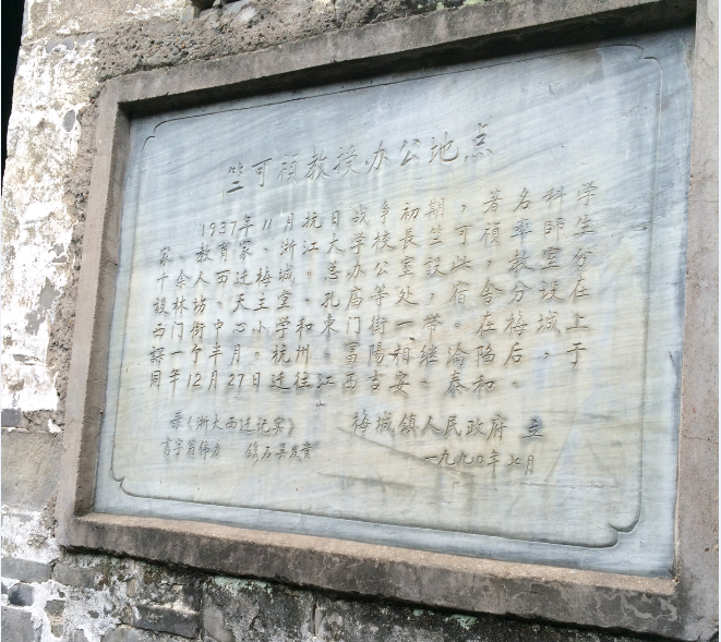 梅城位于建德市境内,是富春江、新安江、兰江三江的交汇处,山环水抱,风光独异。这里曾经是严州府冶,睦州州治和建德县治所在地,有一千多年的建城历史。1937年11月5日,日军在江苏、浙江二省间的金山卫全公亭登陆,形势危急,浙大决定全校往西迁移,就这样历史上著名的“浙大西迁”、“文军西征”启程了。第一站便是建德境内的梅城,11月11日开始,学校本部在竺可桢校长率领下,携带大批图书资料和仪器设备,分三批出发,于15日全部到达建德。