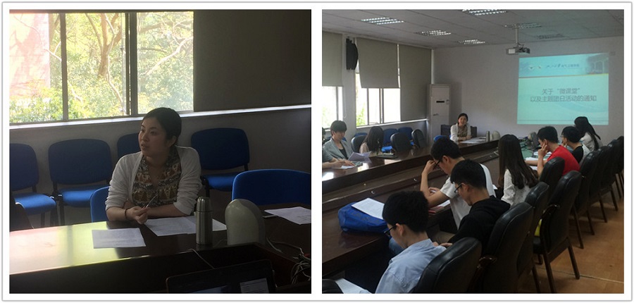 随后,研究生、本科生团总支负责同学对即将开展的主题团日活动以及“微课堂”的内容、形式以及注意要点进行了介绍。“青春勇担当,共筑中国梦”主题团日活动的开展有利于引导团员青年践行社会主义核心价值观,激励团员青年为实现中华民族伟大复兴的中国梦而努力奋斗;对于团支书们提出的问题,卢俏老师以及兼职辅导员梁慧琳都进行了详细的解答,鼓励团支书凝聚团支委智慧,做有创意的活动,有效利用新媒体平台,更好地为同学们服务。“微课堂”活动旨在提高研究生的思想政治素质,通过微话题讨论以及微团课的开展,体现研究生团员的先进性和带头作用,展现研究生团员青年的青春风采和蓬勃的精神面貌。