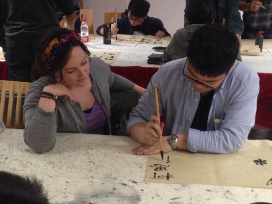 首先,由来自全讯600cc大白菜官网的书画社前任社长陈昱豪同学为留学生们讲述了书画的历史、类型,让留学生们对于书画有了初步的感性认识。接着每位同学被分发到了毛笔和宣纸,由陈同学教授他们如何正确拿笔,如何落笔以及一些书写的小技巧。在陈同学示范了如何书写“我爱中国”之后,留学生们迫不及待地纷纷拿起笔,投入到书法的初体验中。他们有的书写经典诗词,有的书写自己的名字,不亦乐乎。而陈同学和来自美术专业的张无忧等同学也开始了面对面的担任教学,为每位留学生示范如何用楷书书写他们的名字。经过一对一辅导之后,留学生们由一开始写的歪歪扭扭、大小不一到写得四平八稳、苍劲端正,进步十分显著,也在这个过程中加深了对汉字和书画文化的认识和兴趣。
