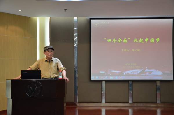 接着,郑老分别从“四个全面”提出的历史背景、深刻的科学内涵、重大的现实意义三个方面详细阐述了他对其的独到理解。他说,现阶段中国的环境日益恶化,贫富差距不断拉大,人民需求不断增加,但国内创新能力差,国外金融危机不断,种种原因使国内矛盾越来越大,形成了各种利益集团,使中国在走向两个百年目标时遇到了阻力。所以,“四个全面”是中国领导人根据中国国情和国际形势提出来的战略布局。全面建成小康社会、全面深化改革、全面依法治国、全面从严治党,这四个全面有着深刻的内涵。郑老指出,十八大提出确保到2020年实现全面建成小康社会宏伟目标的时间表,以及经济持续健康发展,人民民主不断扩大,文化软实力显著增强,人民生活水平全面提高,资源节约型、环境友好型社会建设取得重大进展等具体内涵。在十八届三中全会上又提出“全面深化改革的总目标是完善和发展中国特色社会主义制度,推进国家治理体系和治理能力现代化”,并对经济体制改革、政治体制改革、文化体制改革、社会体制改革、生态文明体制改革和党的建设制度改革进行了全面部署。现阶段我国社会还存在法律不健全、执法不严、司法不公的问题,所以我们应该进行一系列的改革措施,要科学立法、严格执法、司法公正、全面守法,而改革能推进法制建设,法制保障改革进行,改革和法制是相辅相成的。对于从严治党,郑老有着更深刻的认识,他认为从严治党的关键在治,要害在严,革命烈士在渣滓洞中留下的八条警句和当今的八项规定有着惊人的一致,党员们应该从中吸取精神营养,防止腐败堕落。郑老还明确指出“四个全面”是马克思主义的一个巨大的飞跃,是一个中心,两个基本点,三个代表的继续深化,是马克思主义中国化的新成果。