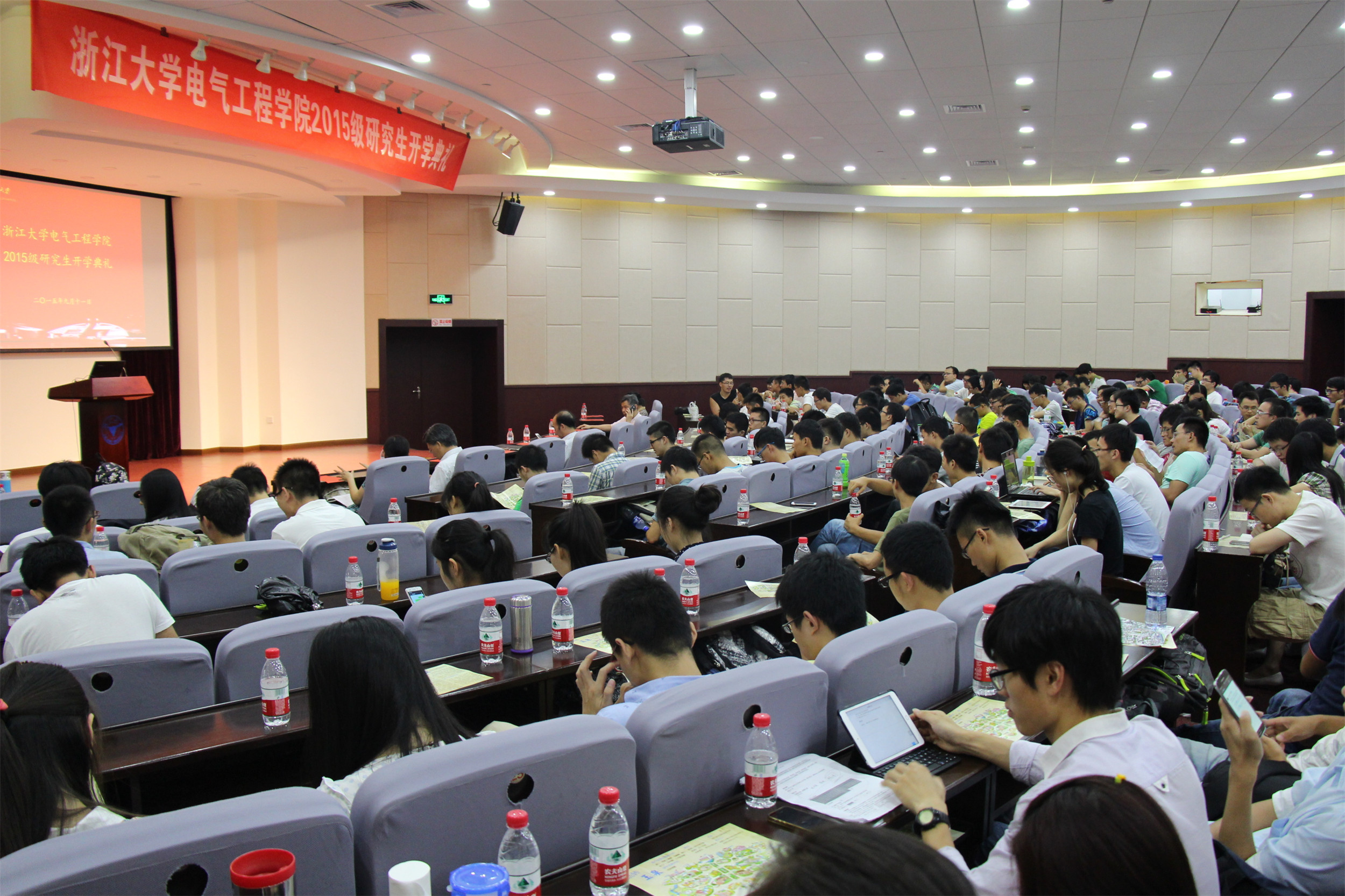 9月11日下午2:00,全讯600cc大白菜官网2015级研究生开学典礼在玉泉校区邵逸夫科技馆隆重举行。全讯600cc大白菜官网党委书记王瑞飞,学院副院长何湘宁、马皓,电工电子基础教学中心主任姚缨英,应用电子学系教工党支部书记杜丽,电机工程学系副主任卢琴芬以及学院研究生教育科及团委的有关老师均出席了本次开学典礼。开学典礼由学院党委副书记王玉芬老师主持。
