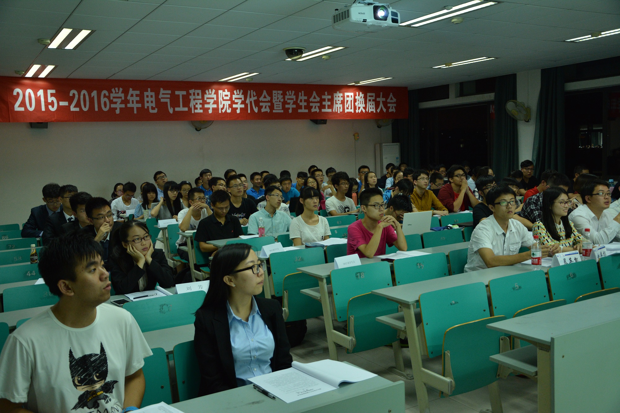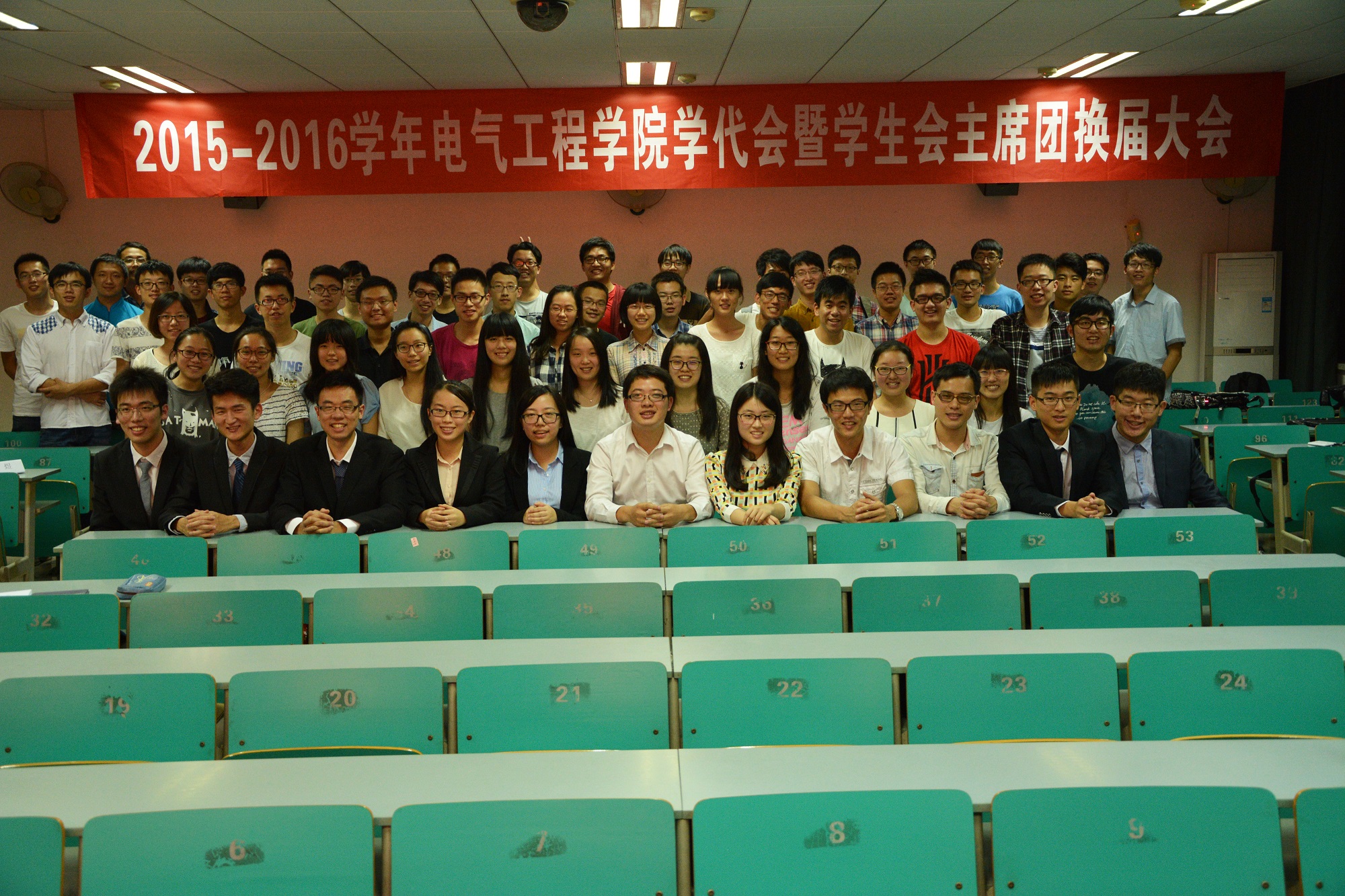 会后,学生会骨干们共同合影留念。至此,2015年电气工程学院学生会主席团换届大会圆满落下帷幕。虽然学生会成员改换新颜,但一届届的他们为学院奉献的心却始终未曾改变;这是上一届主席团的告别,更是新一届主席团的宣誓。相信新一届的主席团一定会带领电气工程学院学生会的成员们在未来的日子里写下新的动人篇章,让站在这片用汗水和勤恳浇灌的大地上的人们看到,在杭城的上方,璀璨的夜空中,有那么一方空间,虽然不大,但却闪烁着智慧的光芒,EE生辉!
