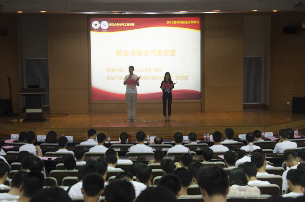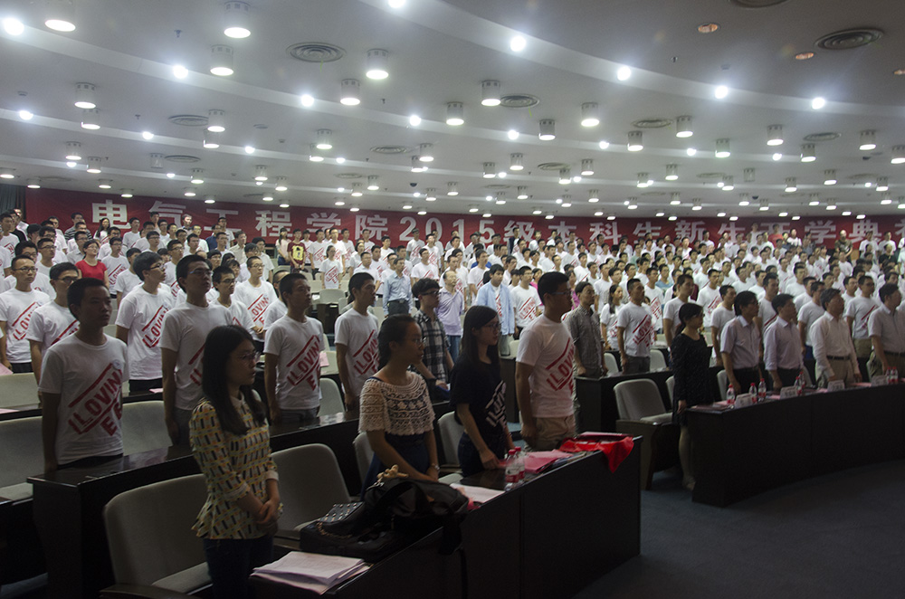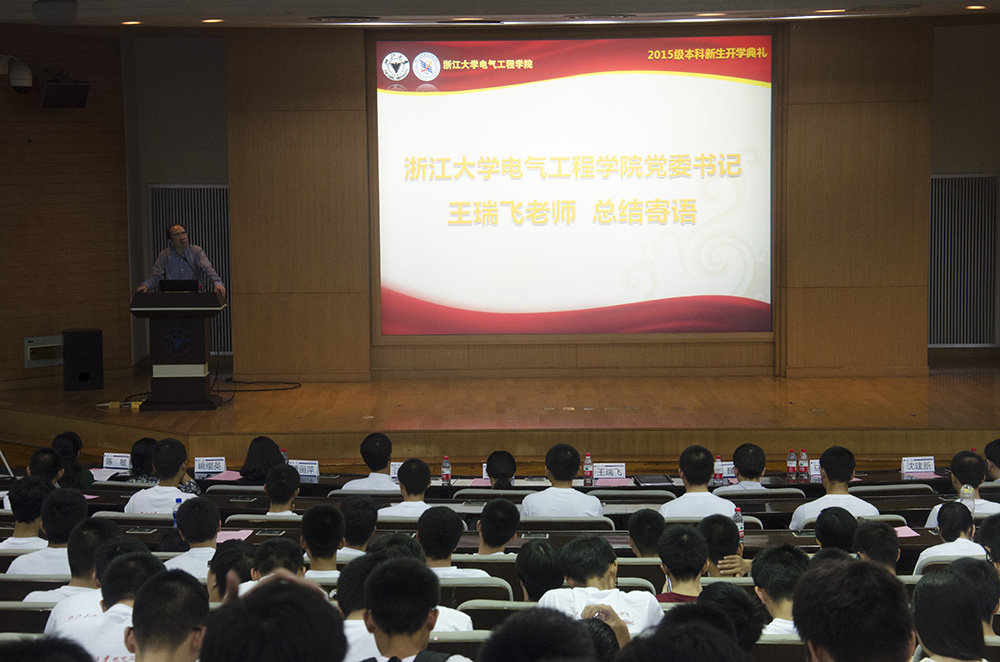 最后,王瑞飞书记送上了对新生的寄语,他希望同学们珍惜自己作为一个电气人的荣誉,继承电气人踏实肯干的特色,在为国建设的道路上不断前行。开学典礼内容纷繁而精彩,但也挡不住时间的流逝,在全体师生嘹亮的浙大校歌合唱声中,电气学院2015级新生开学典礼圆满结束。