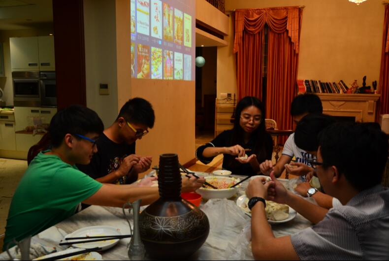 不知不觉,日暮照进窗户,已经到了做饭的时间。之前向同学们征集过菜单并且准备了食材,因此一些厨艺高超的同学自告奋勇地担任了大厨的职位,而在厨房外面的同学也不闲着,包饺子显然是个不错的选择。由几个手艺娴熟的同学向首次尝试的同学进行现场教学,在相互协作中,一列又一列的饺子渐渐铺满了桌面。往往一道菜刚从厨房里捧出,大家便迫不及待地伸出筷子进行品尝,并且大力夸赞在厨房辛勤劳动的“大厨”们,所有人都沉浸在温馨的氛围中无法自拔。