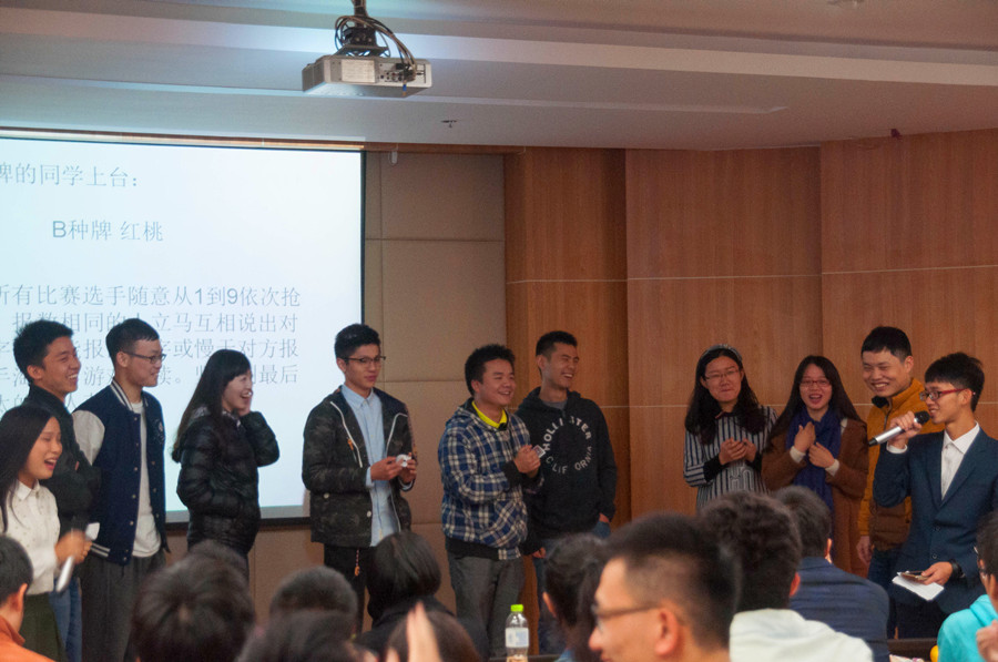 “热播剧”过后,同学们在愉悦的气氛中进行了“报数字游戏”,会场欢声笑语不断,紧张又不失欢乐。随后体育部的“换大米ing” ,和外联部的“虐狗ing” 搞怪不断 ,笑点频频,将大会的气氛推向了又一个高潮。还有学术部的“boys&girls” , 文娱部的“宠爱ing”等。在游戏中,在表演中,在欢声笑语中,大家互相认识。