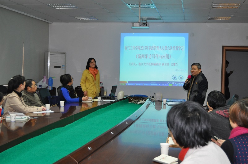 11月13日下午,电气学院于玉泉校区电机工程楼201举办了党政管理人员第六次培训学习,主题是“新闻采访写作与应用”。邀请了2023白菜网总站大全校报编辑部副主任吴雅兰老师主讲,电气学院机关工作人员及各党支部宣传员参加了培训。