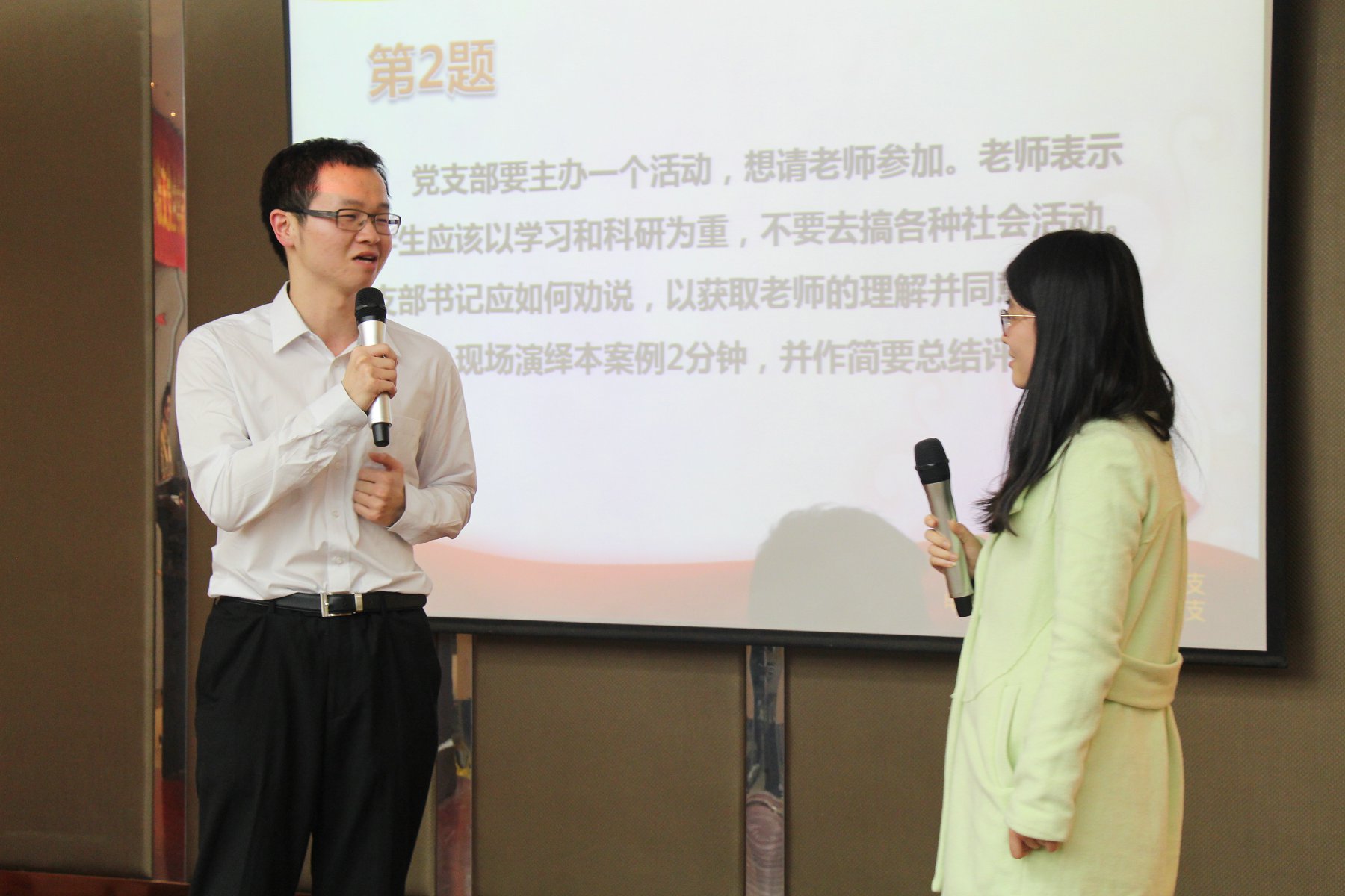 党务知识测试环节考察的是党支书的党建工作实务。7位选手的表现充分体现了电气学院党支部书记扎实的党务素养。比赛进入情景模拟环节,参赛支部书记根据现场抽取的一道案例分析题目,和兼职辅导员配合以情景演绎的方式完成。演绎过程生动展现了基层党支部在工作实践中面临的挑战或困难,党支部书记应有的责任意识和应变能力。妙趣横生的情景模拟将比赛的气氛进一步推向了高潮。