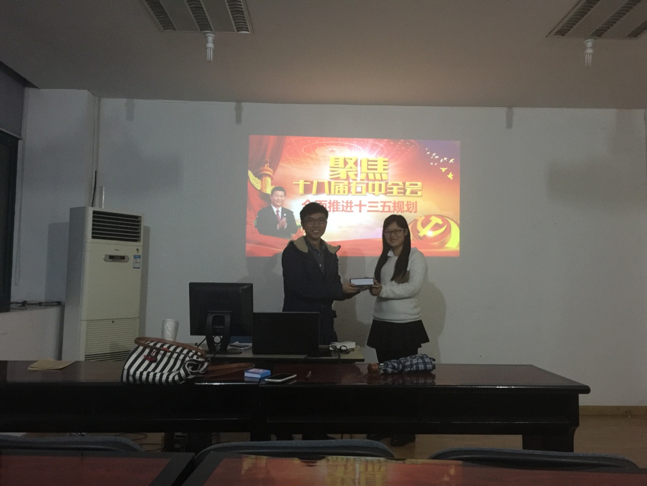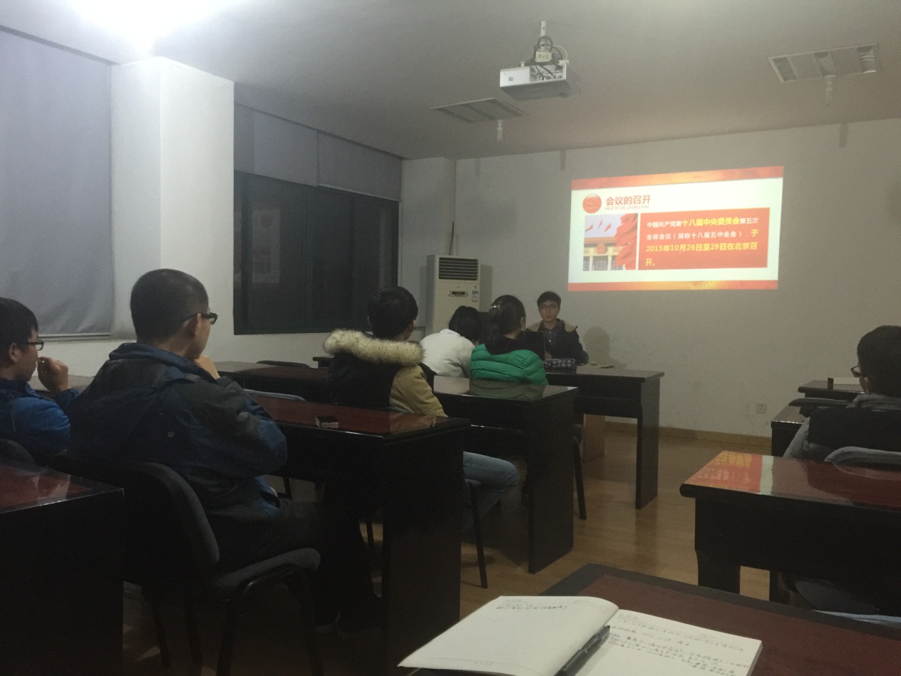 在本次的学习会当中,赵杨同志首先讲解了“十八届”、“五中”、“十三五规划”、“第一个百年计划”等名词,让同志们对本次会议的基本形式及内容有了更加深刻全面的理解和认识。接着赵杨同志为大家简单的介绍本次大会的各项内容,并对本次大会的十个关键词进行了讲解与分析。