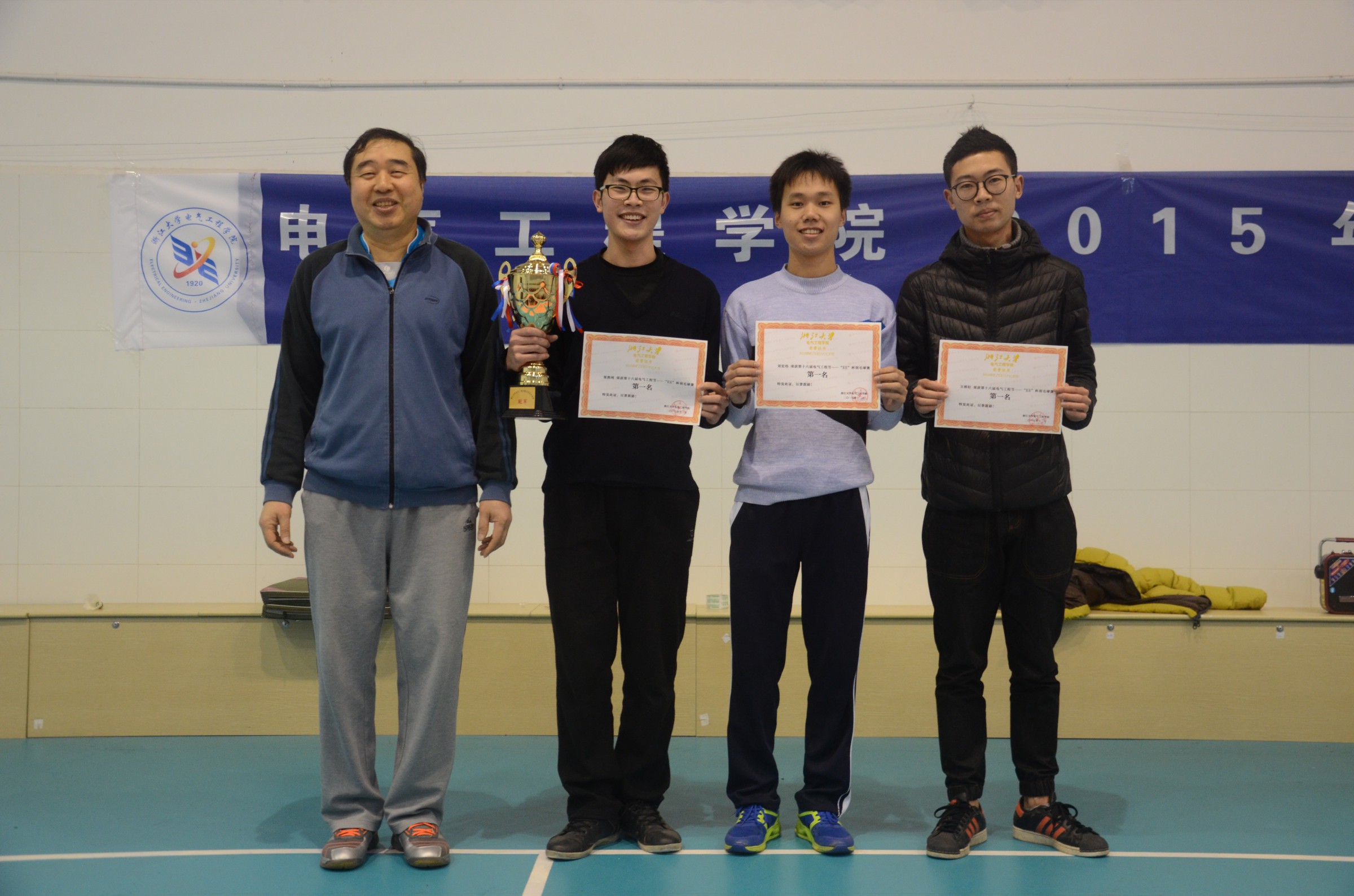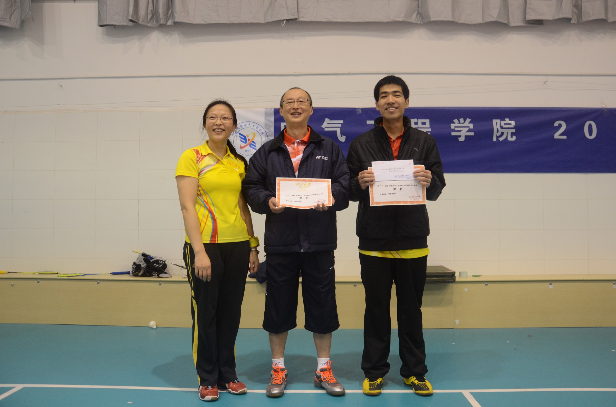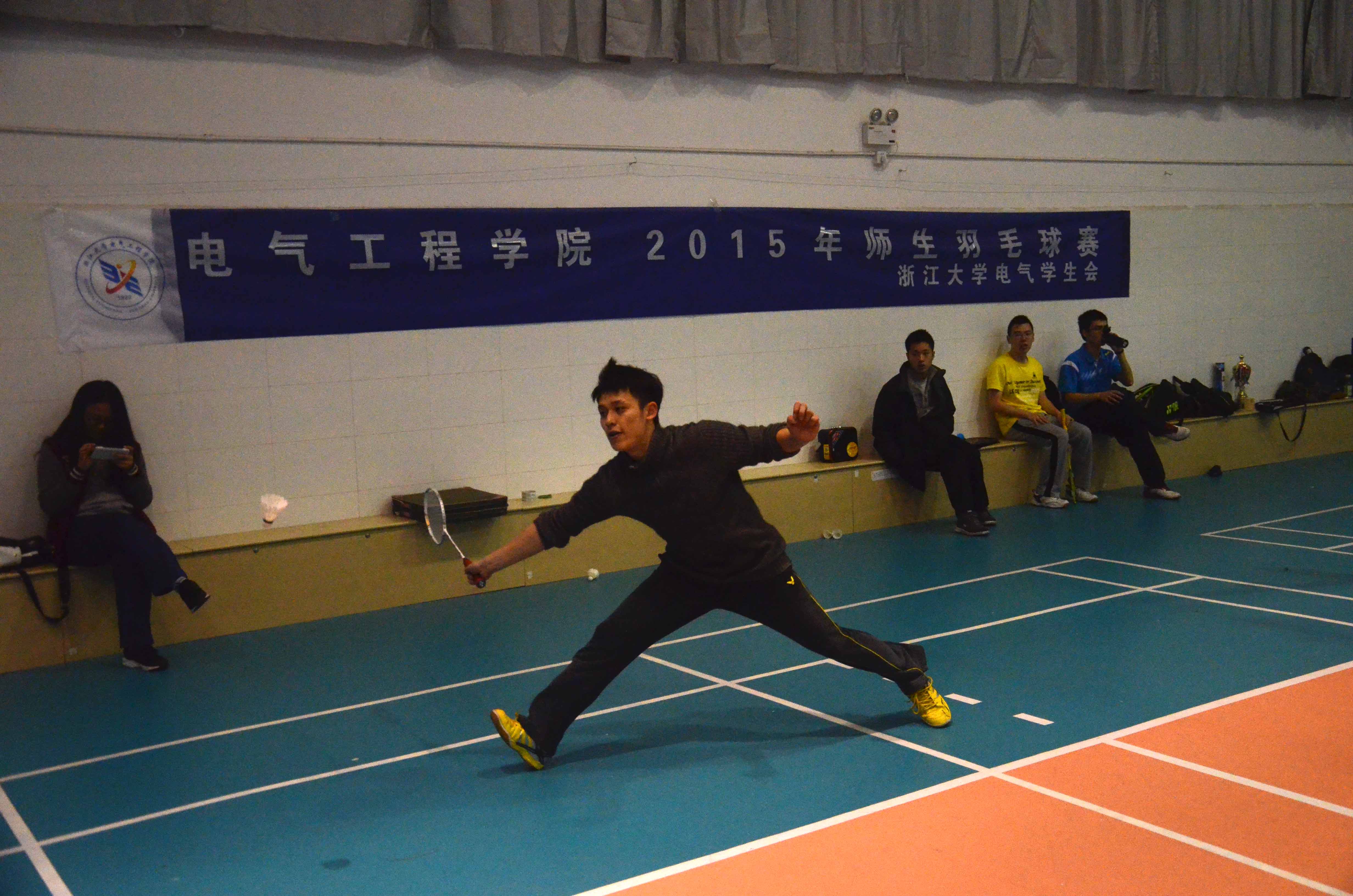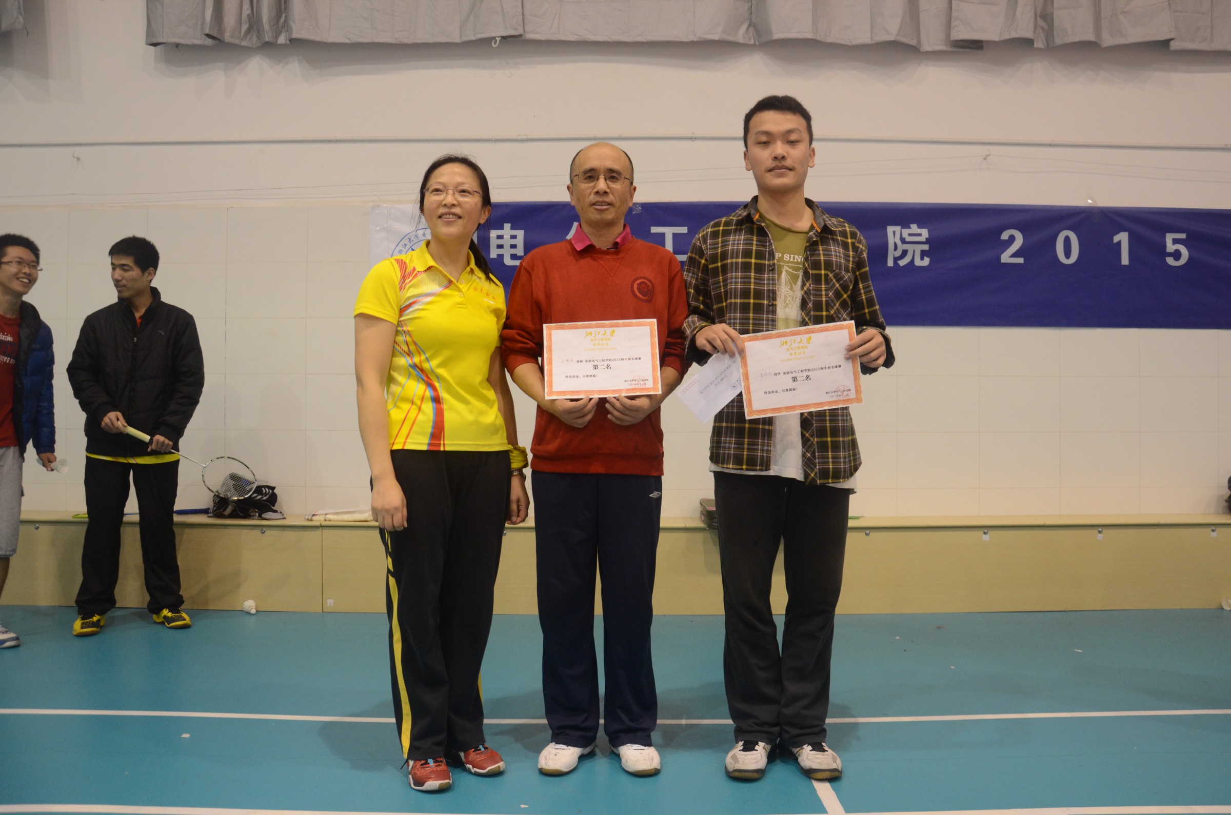 比赛是残酷的,很快今天的战况落定——由徐亮老师和薄耀龙同学组成的队伍在决赛中战胜甘德强老师和李培滔同学,获得本次电气学院2015年师生羽毛球赛的冠军,全场都为他们送上了热烈的掌声。