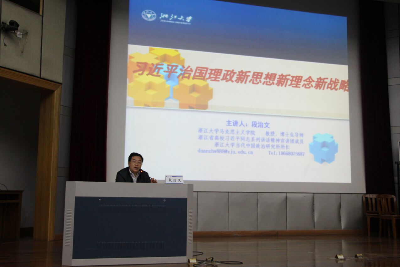 随后,段治文老师从习近平治国理政新思想的演进过程,新目标,新理念和新战略四个方面详细阐述了新一代国家领导人的治国方略。段老师提出,中国是一个政治引领的国家,专业素养应该是我们的基础素养,而政治素养才是我们的首要素养,只有充分了解并理解政治,我们才能把握时代的脉搏,走在时代的前列。在新思想演进过程这一方面,段老师认为,习近平治国理政的新思想内容丰富,覆盖范围十分广泛,所以细致分析的方法不可取,我们应采用整体把握的方式进行学习,要抓住“中国梦”这个目标与主线,理解这一目标提出的前提,实现的具体战略以及保证其实现的法制基础。在新目标这一部分,段老师通过总结建设小康社会这一总体目标在不同时期的具体变化,解读了党和国家在近20年来的发展形势变化,并最终提出,我党始终把“追求人的幸福”作为最根本的战略目标。在新理念这一方面,段老师结合党的十八届五中全会提出的“创新、协调、绿色、开放、共享”五大发展理念,对党在新时期治国理政的指导理念进行了深入阐释。在新战略这一部分,段老师结合我国近年提出的一些政策方针总结出包括共建创新型发展体制,推进法治国家建设,推进“一带一路”互联互通等在内的十大战略。