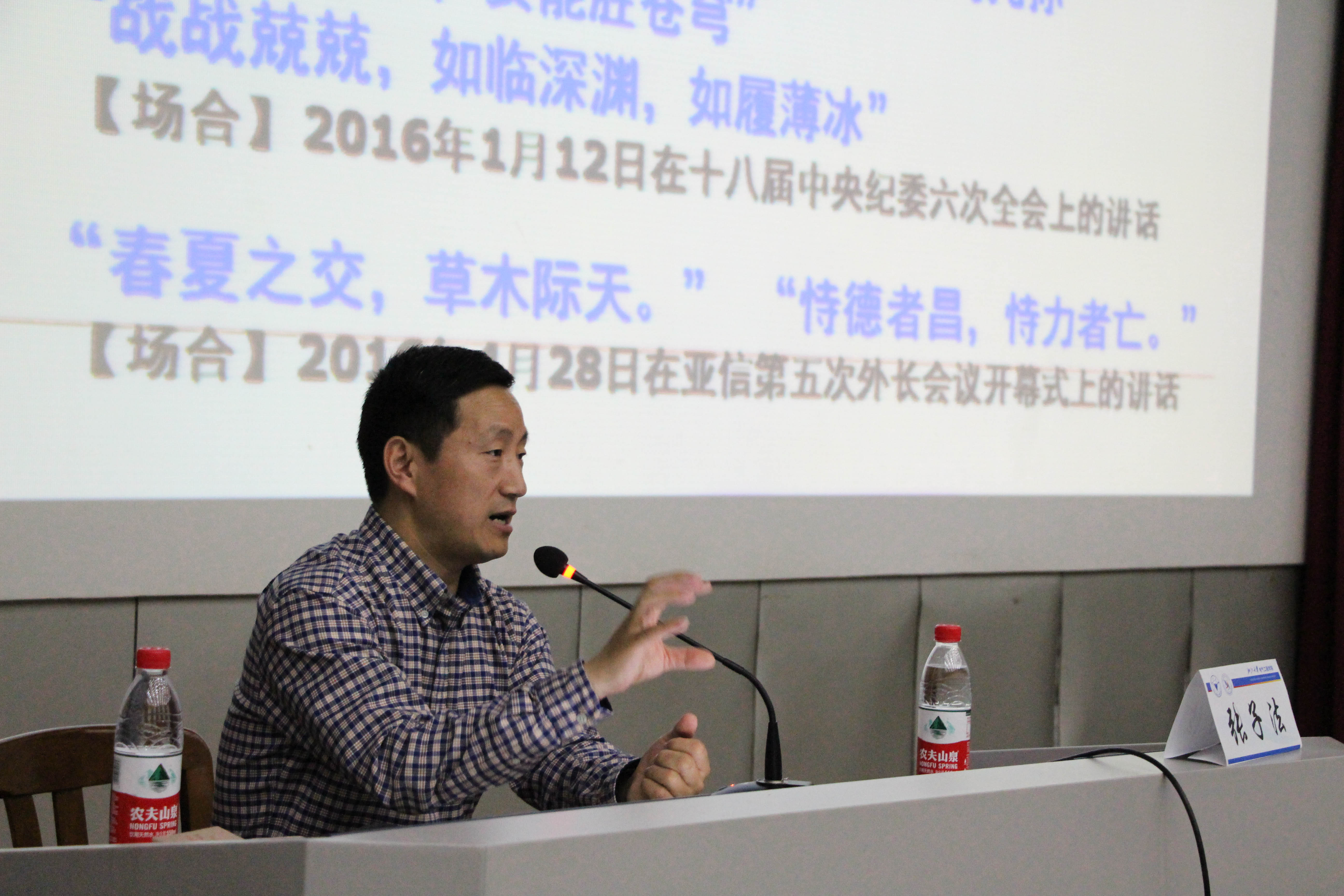 本次报告会由陈敏老师主持,她首先对学院“先锋学子”培训计划的开展情况做了简要的说明,然后隆重介绍了本次报告会的主讲嘉宾张子法老师。紧接着张老师以“学思中华文化智慧,践悟反腐倡廉之道”为题,从习近平用典一事引出传统文化的重要性。他首先举了六尺巷、西湖申遗、“西湖三杰”等例子阐述了中华文化的源远流长与博大精深。随后,结合习近平用典与王岐山用典的一系列具体事例阐明,中国政府力图打造一个“不敢腐,不想腐,不能腐”的政治氛围,由此引出了我们国家最新公布的《中国共产党廉洁自律准则》。在张子法老师看来,新版的廉洁自律准则充满了传统文化的气息,它拥有形式之美,内容之美与意境之美。形式之美体现在其言简意赅,凝练节制;内容之美体现在其知、情、意、行统一;意境之美体现在其神形兼备,意境深远。张子法老师指出,新的廉洁自律准则的覆盖面从原来的党内县级以上领导干部到全体党员,范围从原来的80多万人扩大到8800万人,这是一个重大的改变,说明廉洁自律是我们每一名党员的责任,要从最基层做起。最后,张子法老师又和我们分享了“公烛不展家书”,“天知、地知、你知、我知”、“为官避事平生耻”等几个典型事例,告诫我们所有党员都要严格遵守廉洁自律准则,做合格党员。张子法老师的报告结合诸多事例,深入浅出,为广大师生奉献了一堂发人深思的廉洁自律政治教育课。