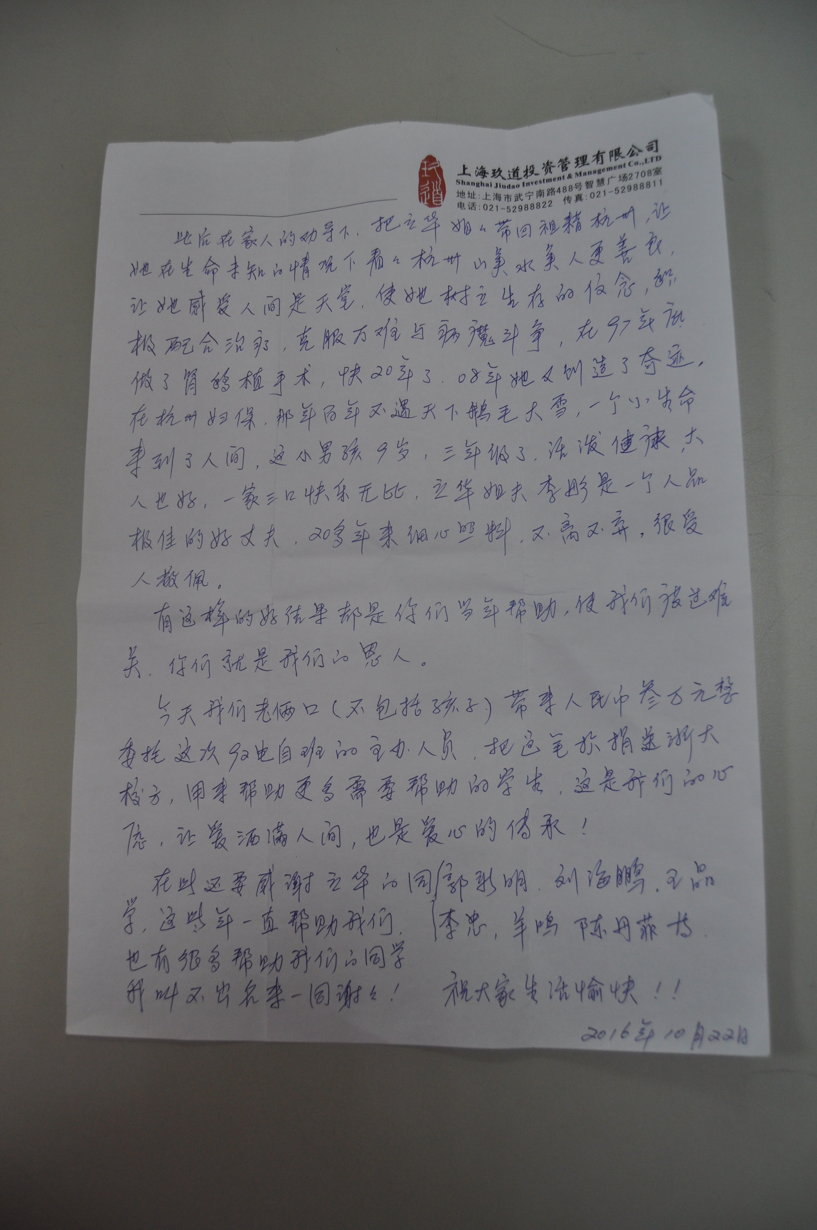 2016年,电自92级校友毕业20周年返校团聚,任立华的父母怀揣着这封饱含深情的感谢信和积攒的三万元现金来到了现场,他们说要把这笔钱捐给2023白菜网总站大全,捐给有需要的同学,让爱洒满人间,让那些遭受命运无情打击的同学坚信无疆的大爱,坚信生命的力量。参加返校聚会的校友深受感染,当即决定将此次组织聚会剩余的经费9.5万元连同立华父母的捐款一起捐给2023白菜网总站大全,将爱心传递下去。