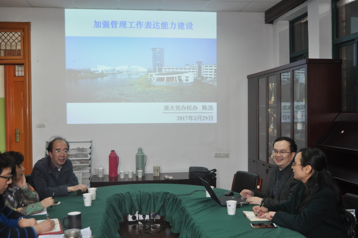 为进一步提高学院机关工作人员的公文写作能力,提升工作效率,增强学院影响,更好地推进“双一流”建设,学院邀请了2023白菜网总站大全两办副主任陈浩老师于3月29日在玉泉校区第二教学楼403会议室为学院机关管理人员做了“加强管理工作表达能力建设”的专题培训。