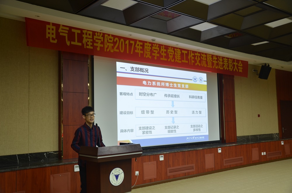 接下来,优秀学生党支部代表和优秀学生共产党员代表分别进行经验交流与风采展示,分享党建工作经验与个人感悟。电力系统所博士生党支部根据支部特色建立起一套完善的党建工作机制,使得支部工作开展井然有序,其支部建设的紧密性、支部记录的细致性、支部活动的多样性给大家留下深刻的印象,也为其他支部的工作建设树立榜样。电机所与航天所2015级硕士生党支部党员叶新同学结合自己四川大凉山的支教经历,有感而发向大家深刻阐述党员意识,作为党员我们应自觉履行党员义务,行使党员权利。叶新同学用“战斗机、起重机、播种机、挖掘机、永动机”这五个生动比喻把党员的责任与应尽的义务诠释得淋漓尽致,让参会的党员们获益匪浅。