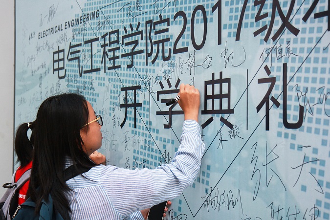 临水报告厅外,17级本科新生们在签名墙上写下姓名留念。临水报告厅内,一段精彩的暖场街采视频后,新生开学典礼正式开始。奏唱国歌后,一段精彩沙画视频带领大家回溯了全讯600cc大白菜官网悠久而辉煌的历史,近百年的办学历程沉淀的是电气人对“求是创新”校训的坚守和初心。