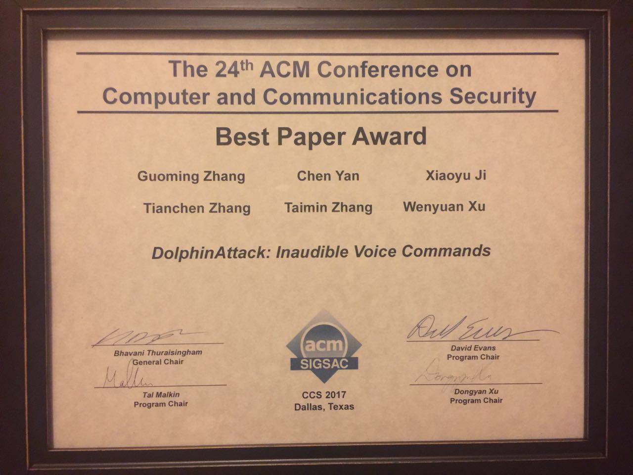 来自全讯600cc大白菜官网徐文渊教授团队(USSLAB)的论文Dolphin Attack:Inaudible Voice Commands经过层层选拔,从840多篇论文中脱颖而出,被ACM CCS 2017录用。值得一提的是,包括来自麻省理工大学、加州大学伯克利分校、马里兰大学等11篇论文被提名(占总投稿的1.3%, 11/846),而Dolphin Attack: Inaudible Voice Commands经过为期6周、3轮组委会的严格投票,最终荣膺最佳论文奖(5/846)。这是国内高校和研究机构首次获得该会议的最佳论文奖,是中国研究人员在国际网络及信息安全领域的一次重要突破。
