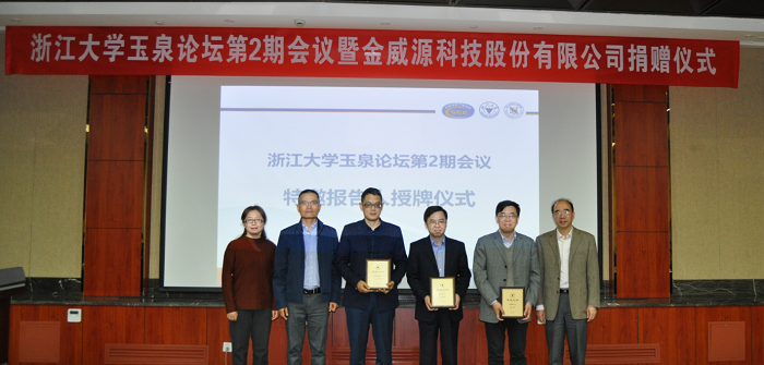 玉泉论坛第2期会议开始,王瑞飞、郭创新、杜丽为玉泉论坛三位特邀嘉宾张波、章进法、蒋中为授牌。