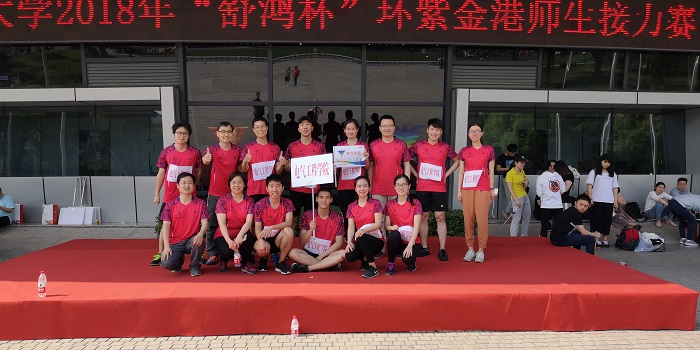 本次比赛,学院代表队由10名教师和4名学生组成。赛前,学院运动队对各位运动员的特点进行综合评估,合理规划了比赛的棒次及战略。穿着统一运动服的老师和同学们在一起愉快地交流比赛经验,认真做好赛前热身准备。参赛的学生表示,“和老师一起参加比赛感觉好新颖,是很难得的机会。”活动第一棒由校工会叶民主席率各单位党政领导、工会主席领跑,开启2018年学校全民健身运动序幕,学院工会主席章玮老师举着代表学院的小旗跑在队伍的前列。随后正式比赛开始,参赛选手们健步如飞,全力以赴,尽情挥洒汗水,在一棒又一棒的交接中将拼搏精神发挥到了极致。